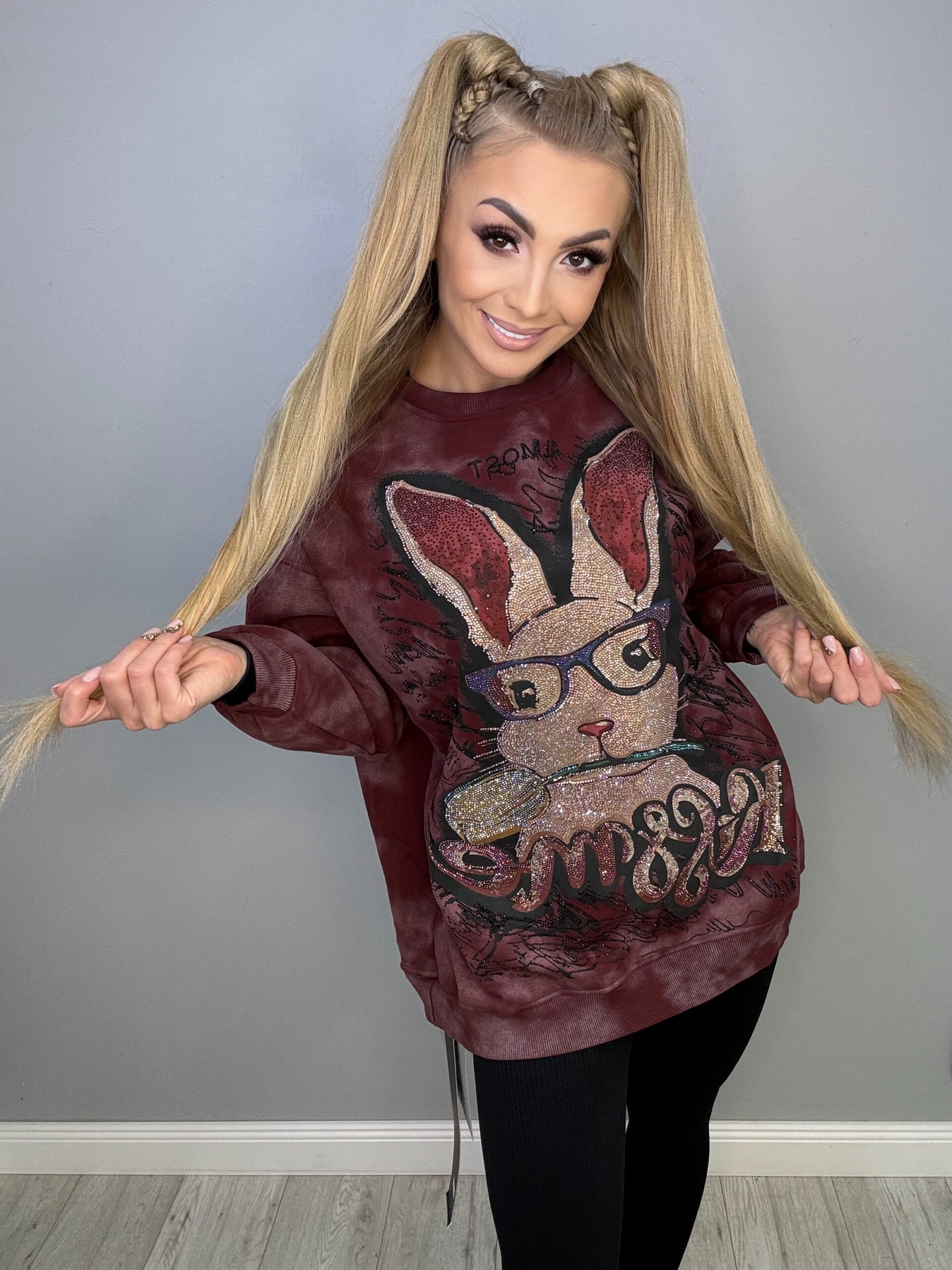 Odkryj naszą luksusową bluzę premium, która zachwyca wyjątkowym stylem i jakością. Cała wysadzana przepięknymi cyrkoniami, które mienią się w świetle, ta bluza to prawdziwa perełka w każdej garderobie. Urokliwy motyw aplikacji z grafiką wesołego królika dodaje jej oryginalnego charakteru.