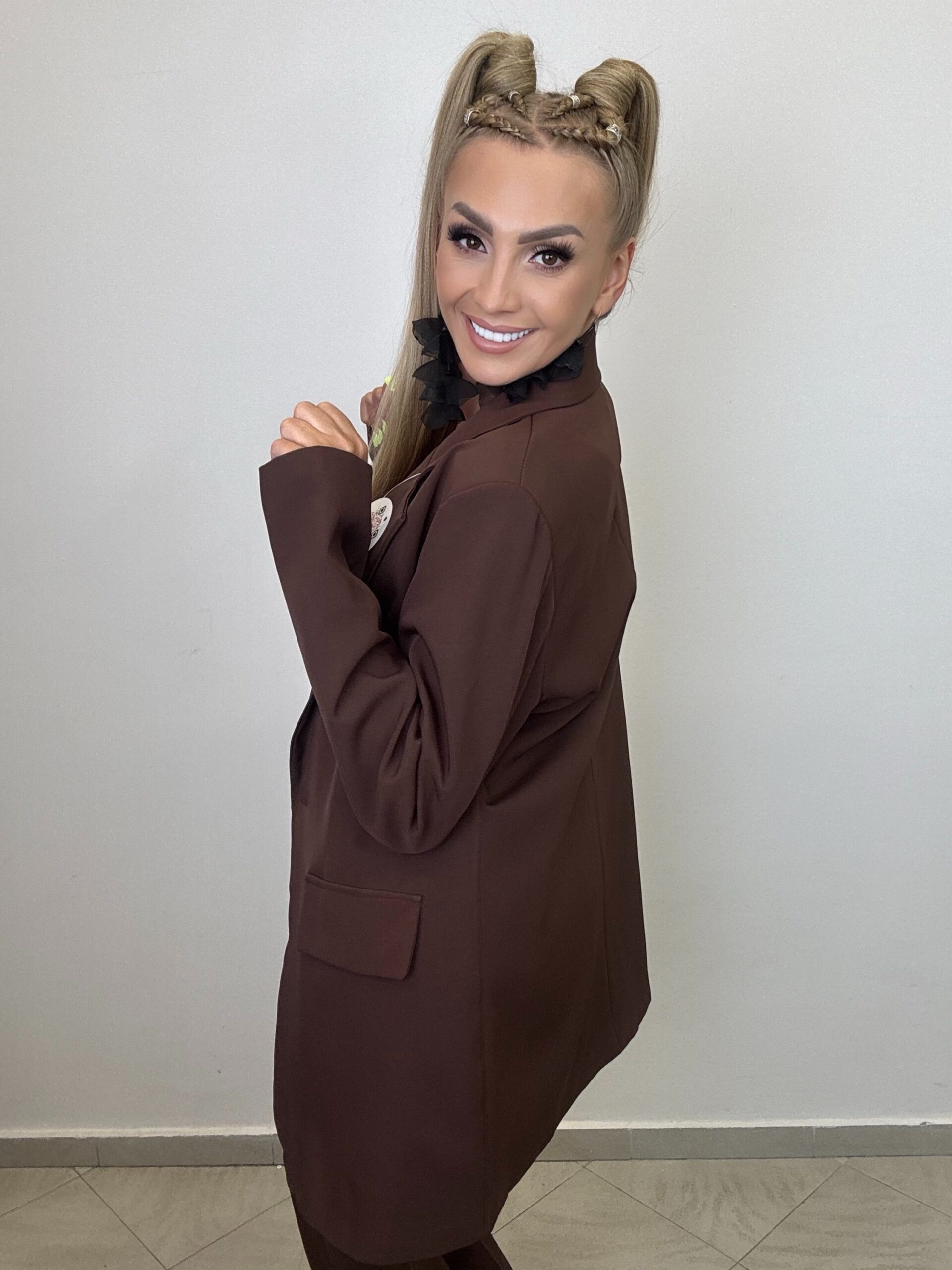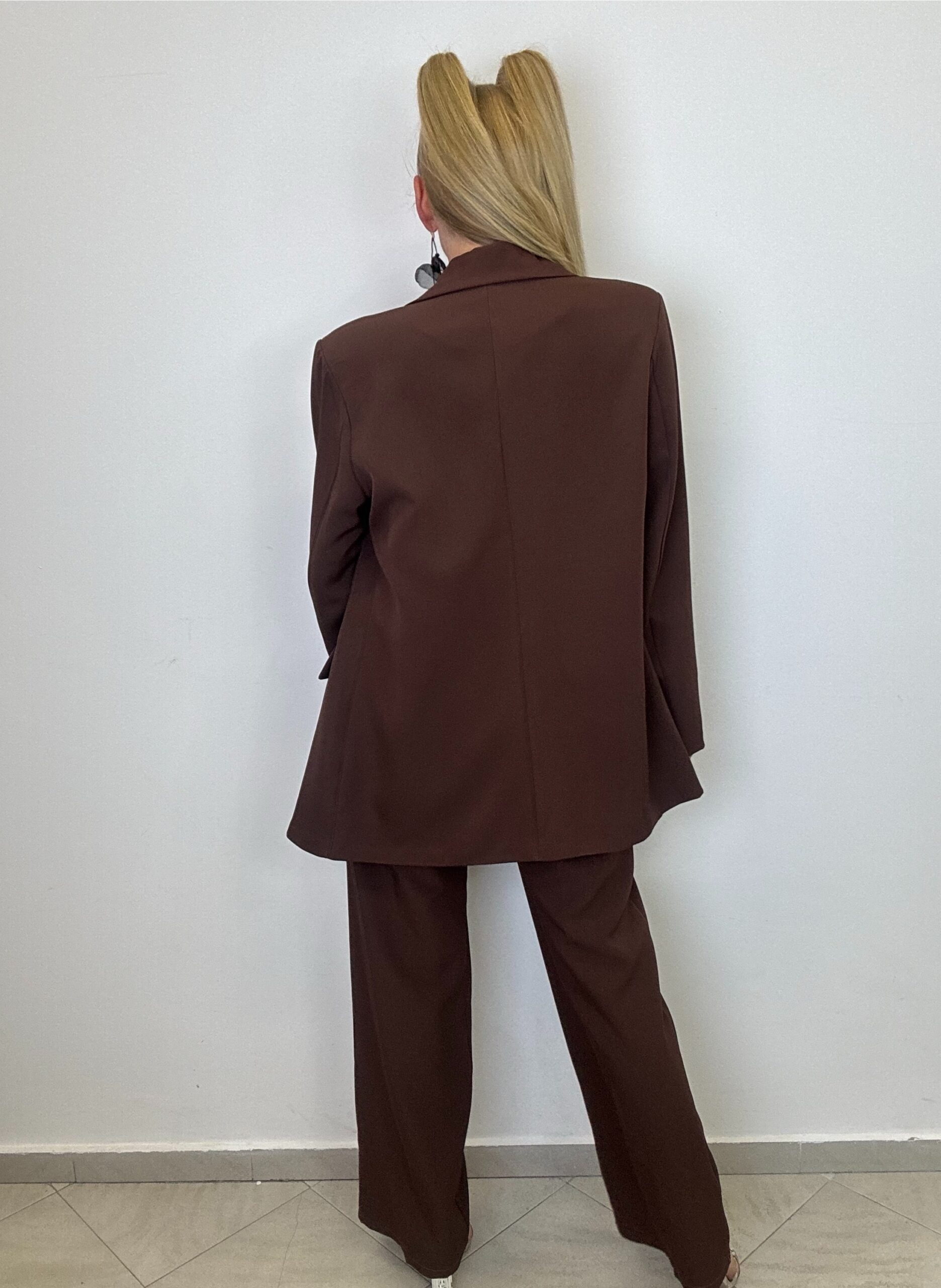 Elegancki, stylowy komplet w odcieniu głębokiego brązu – idealny zarówno na oficjalne wyjścia, jak i modowe sesje.