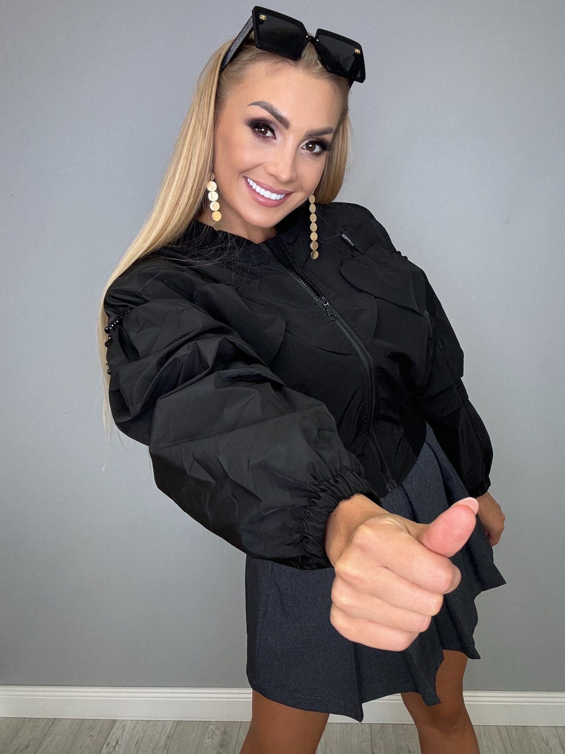 Czarna bomberka to wyjątkowa kurtka, która łączy w sobie nowoczesny styl i elegancję. Charakteryzuje się poszerzonymi rękawami, w górnej części rękawów umieszczone są piękne czarne kryształki ozdobne, które subtelnie błyszczą i przyciągają wzrok.