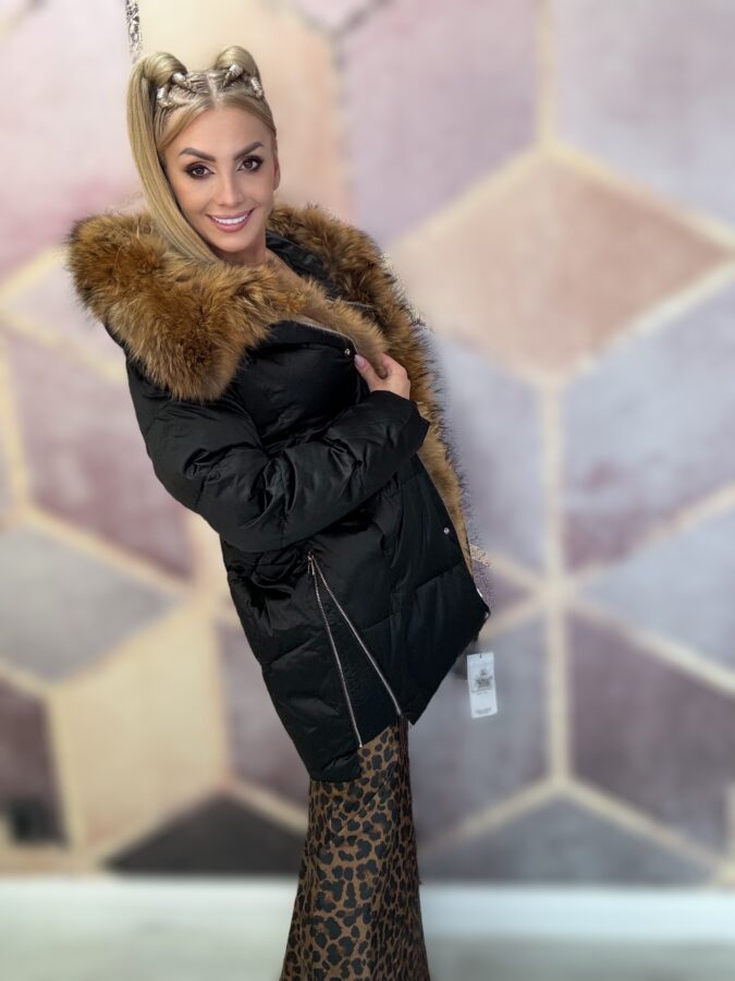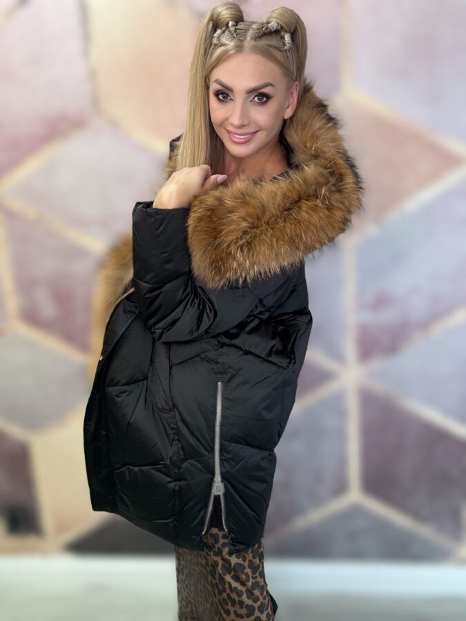 Długa kurtka puchowa w czarnym kolorze, ozdobiona obszernym futrem naturalnym, to doskonała propozycja premium dla kobiet, które cenią sobie ciepło i komfort. Idealnie łączy elegancję z funkcjonalnością, zapewniając ochronę przed zimnem w stylowy sposób.