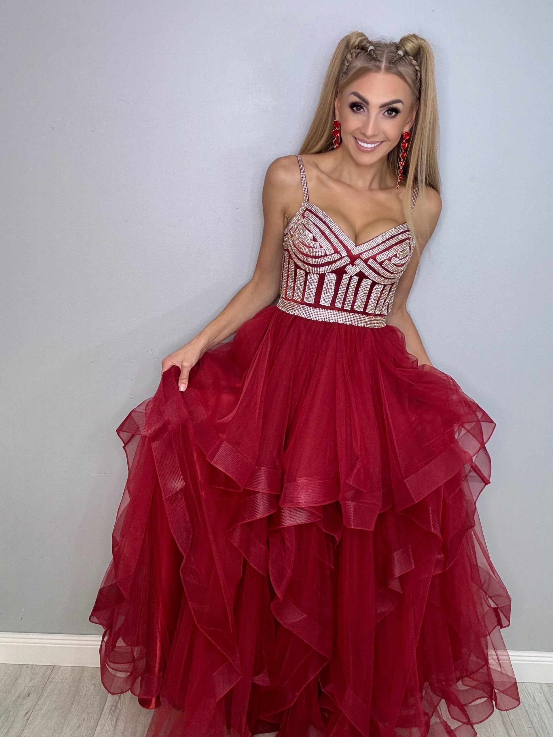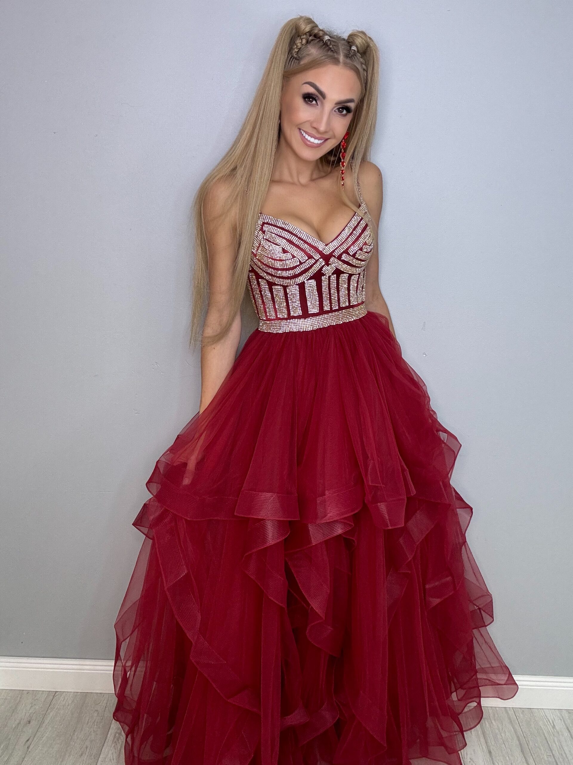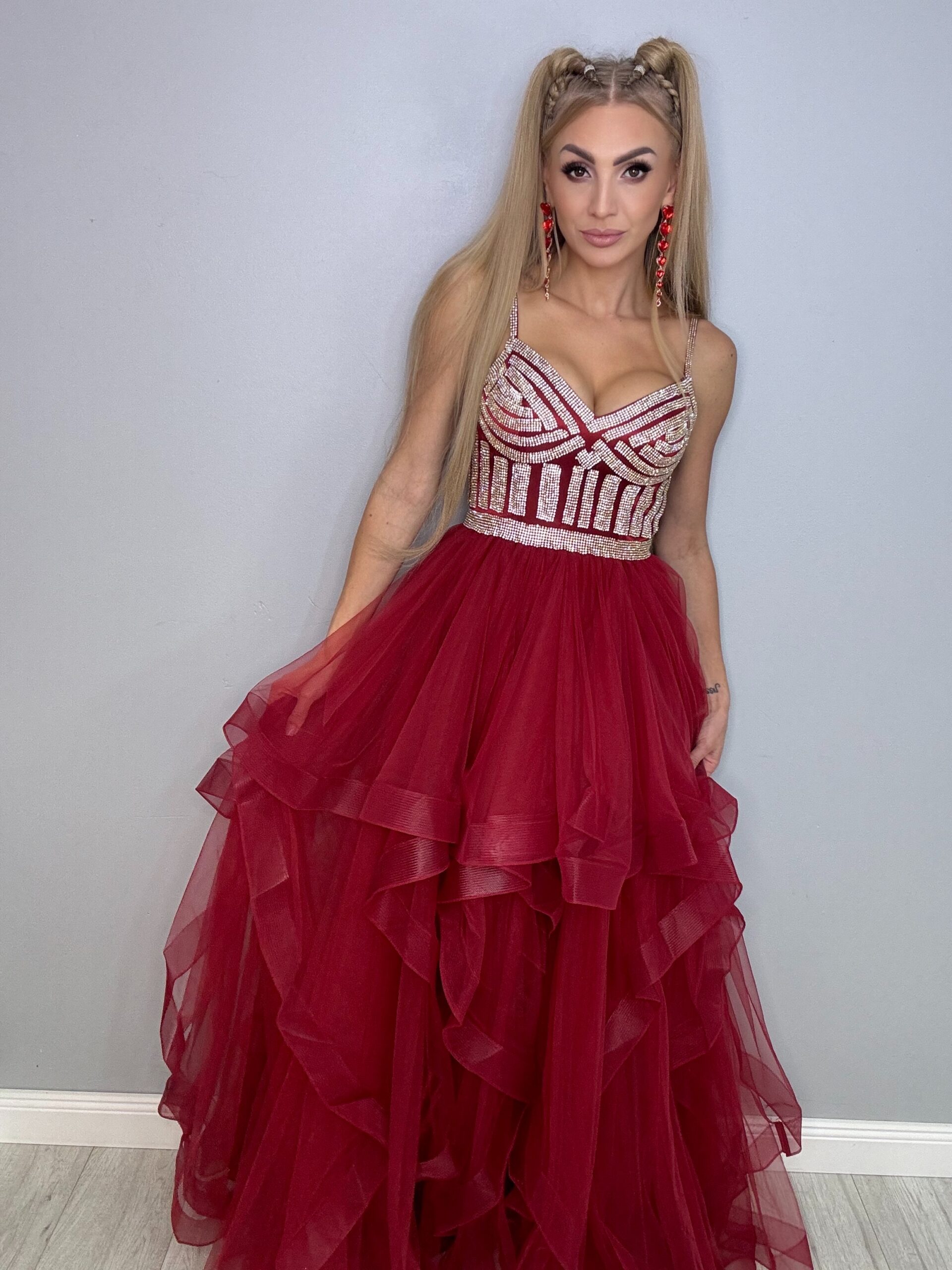 Ta przepiękna suknia balowa to kwintesencja elegancji i luksusu, idealna na studniówkę, wesele i inne wyjątkowe okazje. Długa, zdobiona mieniącymi się detalami, świetnie podkreśla sylwetkę. Warstwy falban dodają lekkości i romantyzmu, sprawiając, że każda kobieta poczuje się jak prawdziwa królowa balu. Z tą suknią na pewno przyciągniesz wszystkie spojrzenia!