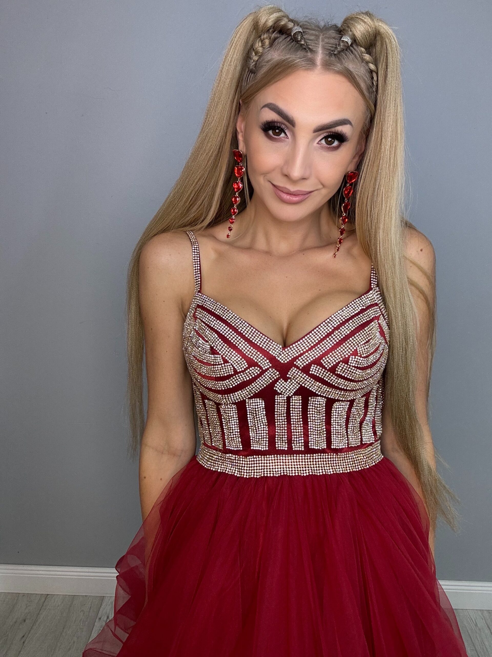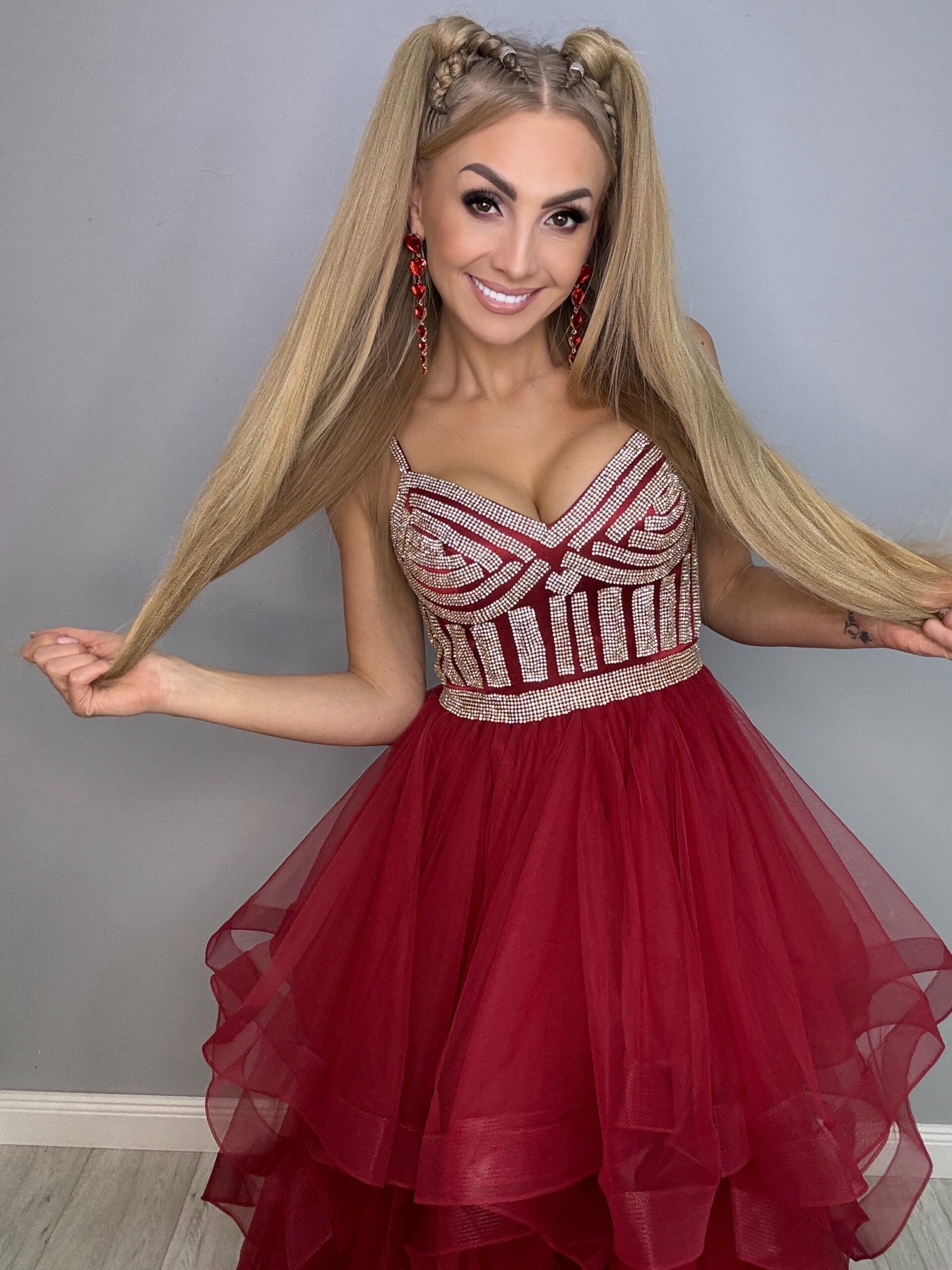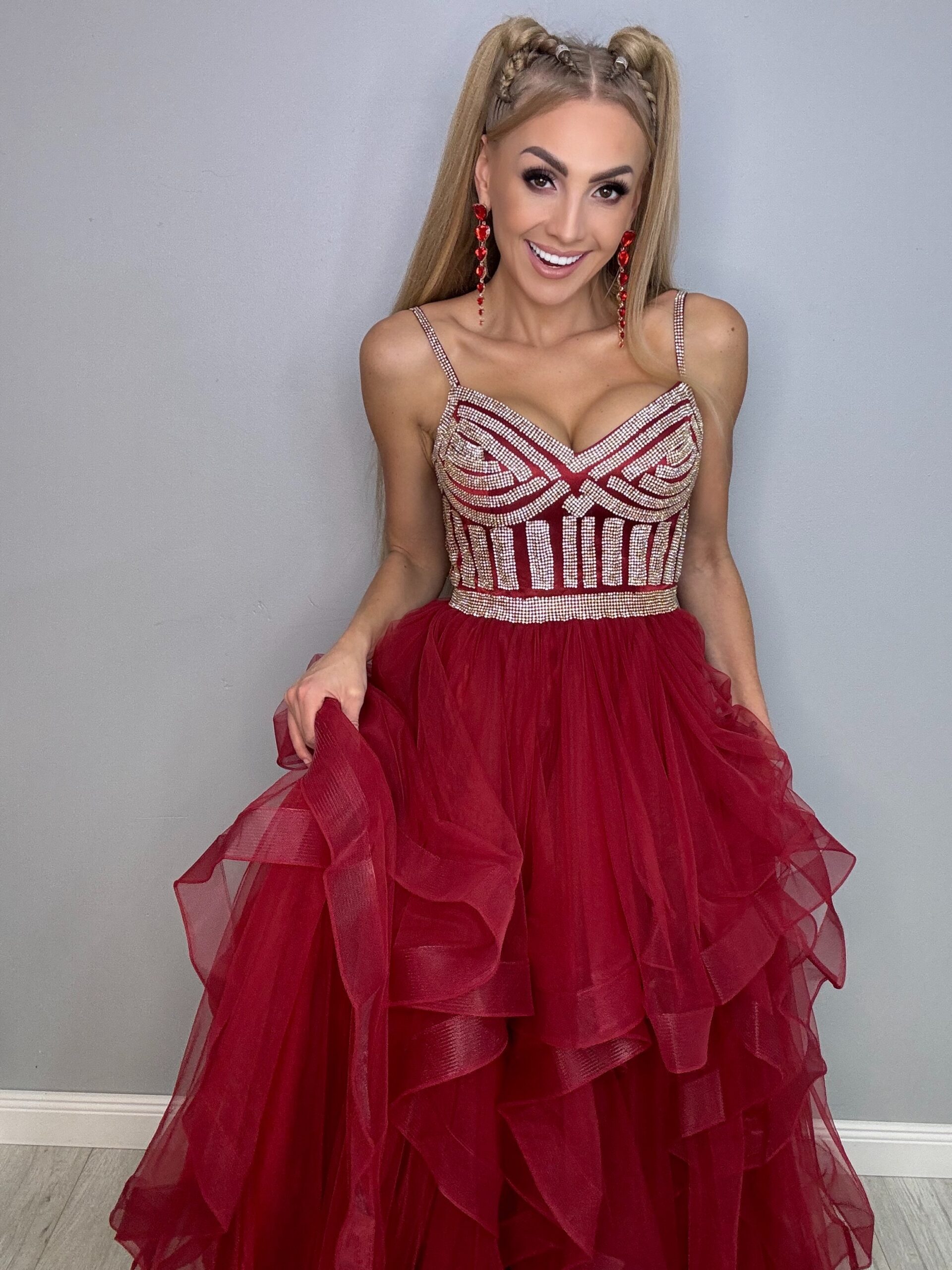 Ta przepiękna suknia balowa to kwintesencja elegancji i luksusu, idealna na studniówkę, wesele i inne wyjątkowe okazje. Długa, zdobiona mieniącymi się detalami, świetnie podkreśla sylwetkę. Warstwy falban dodają lekkości i romantyzmu, sprawiając, że każda kobieta poczuje się jak prawdziwa królowa balu. Z tą suknią na pewno przyciągniesz wszystkie spojrzenia!