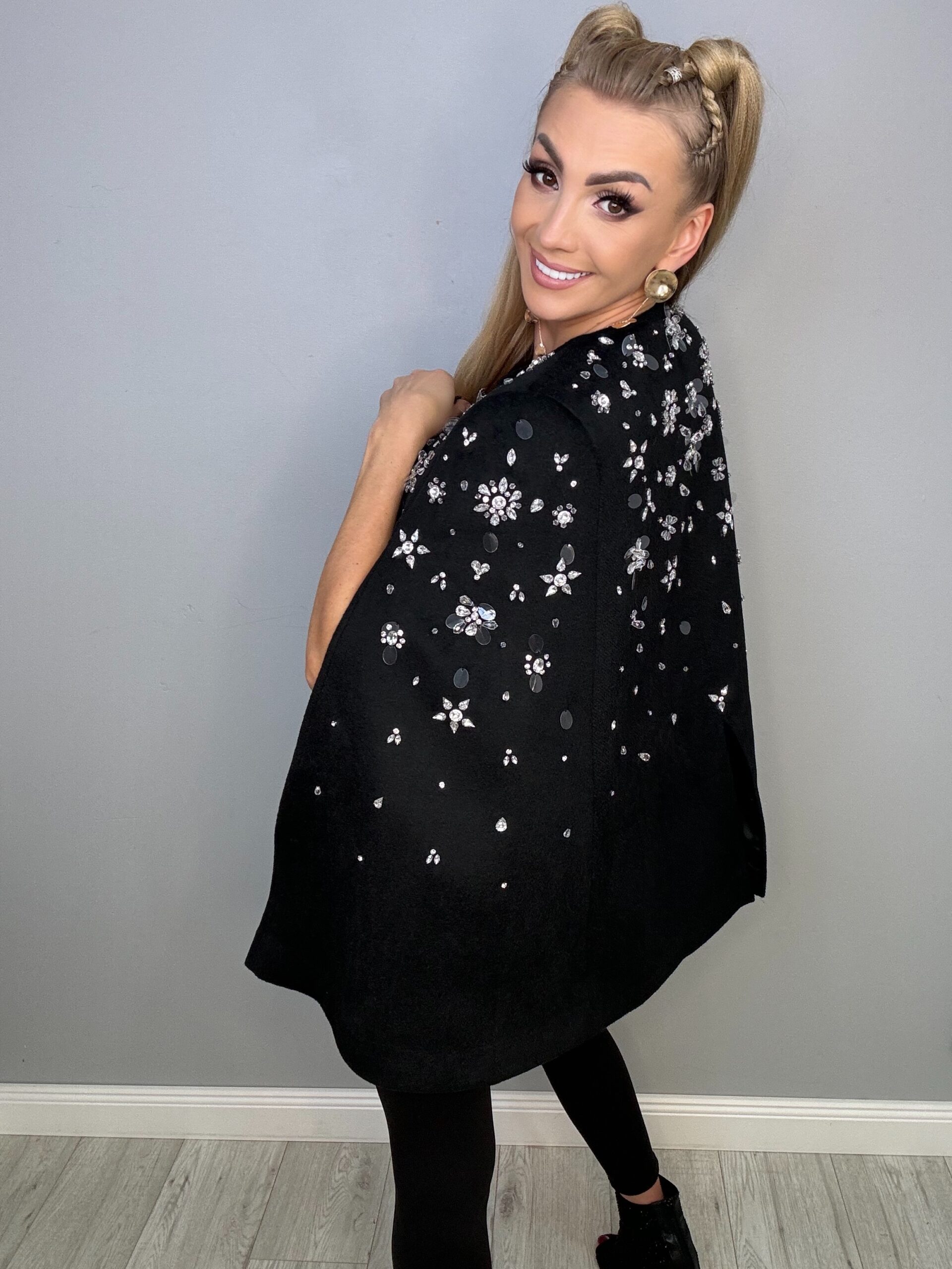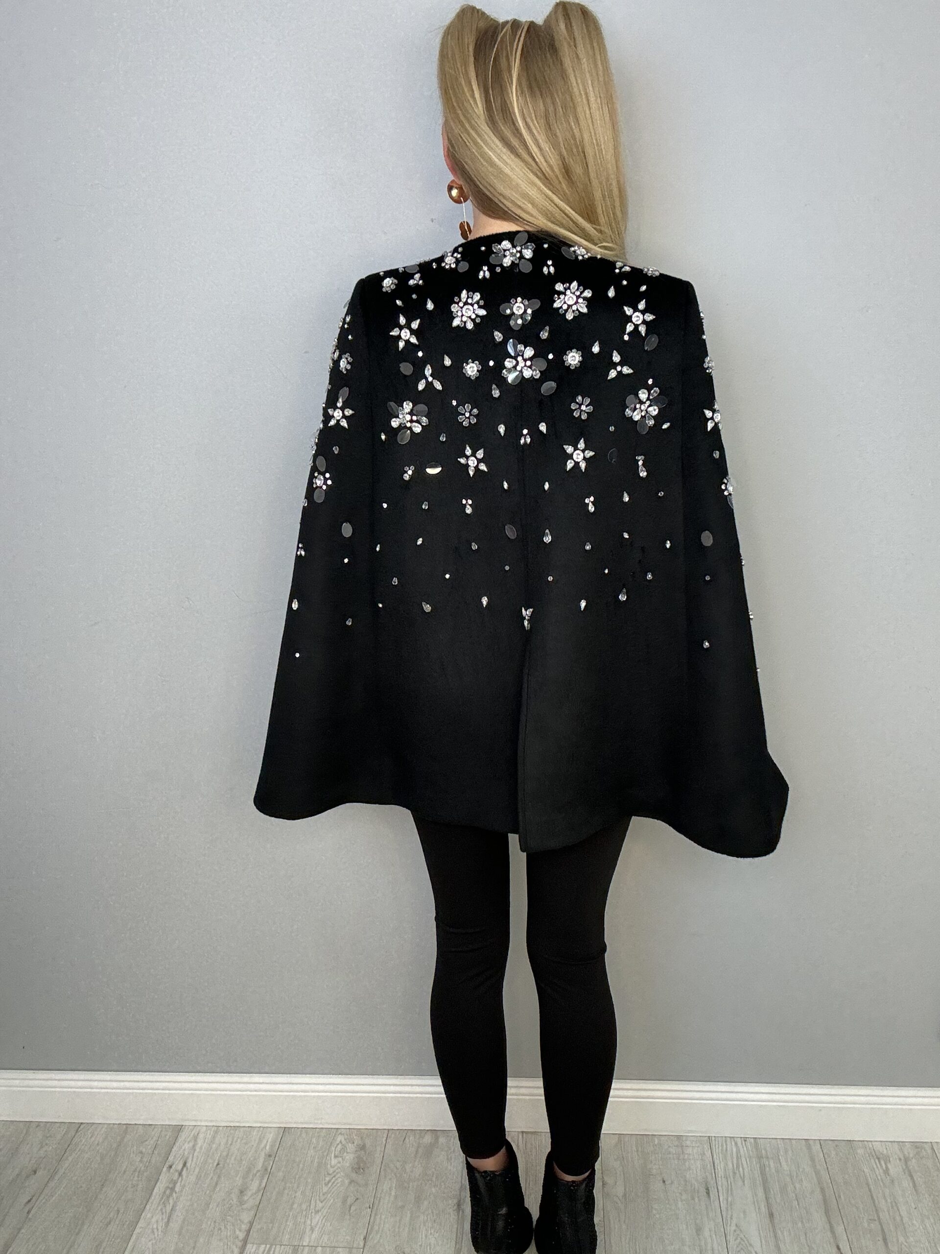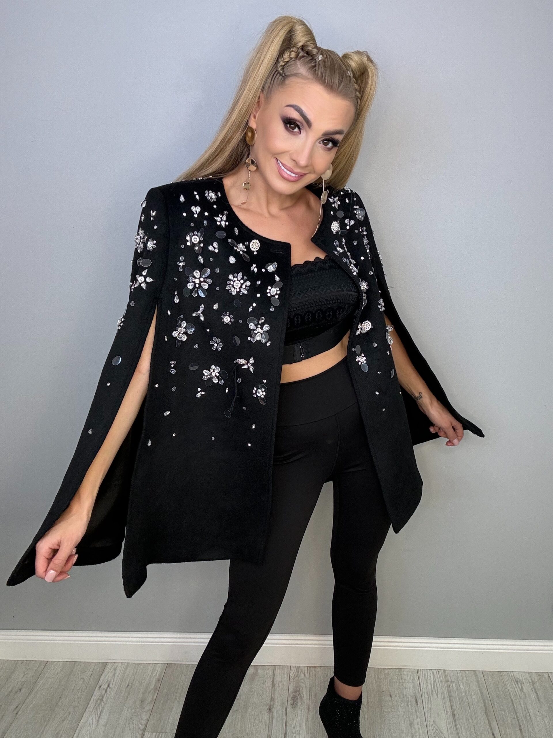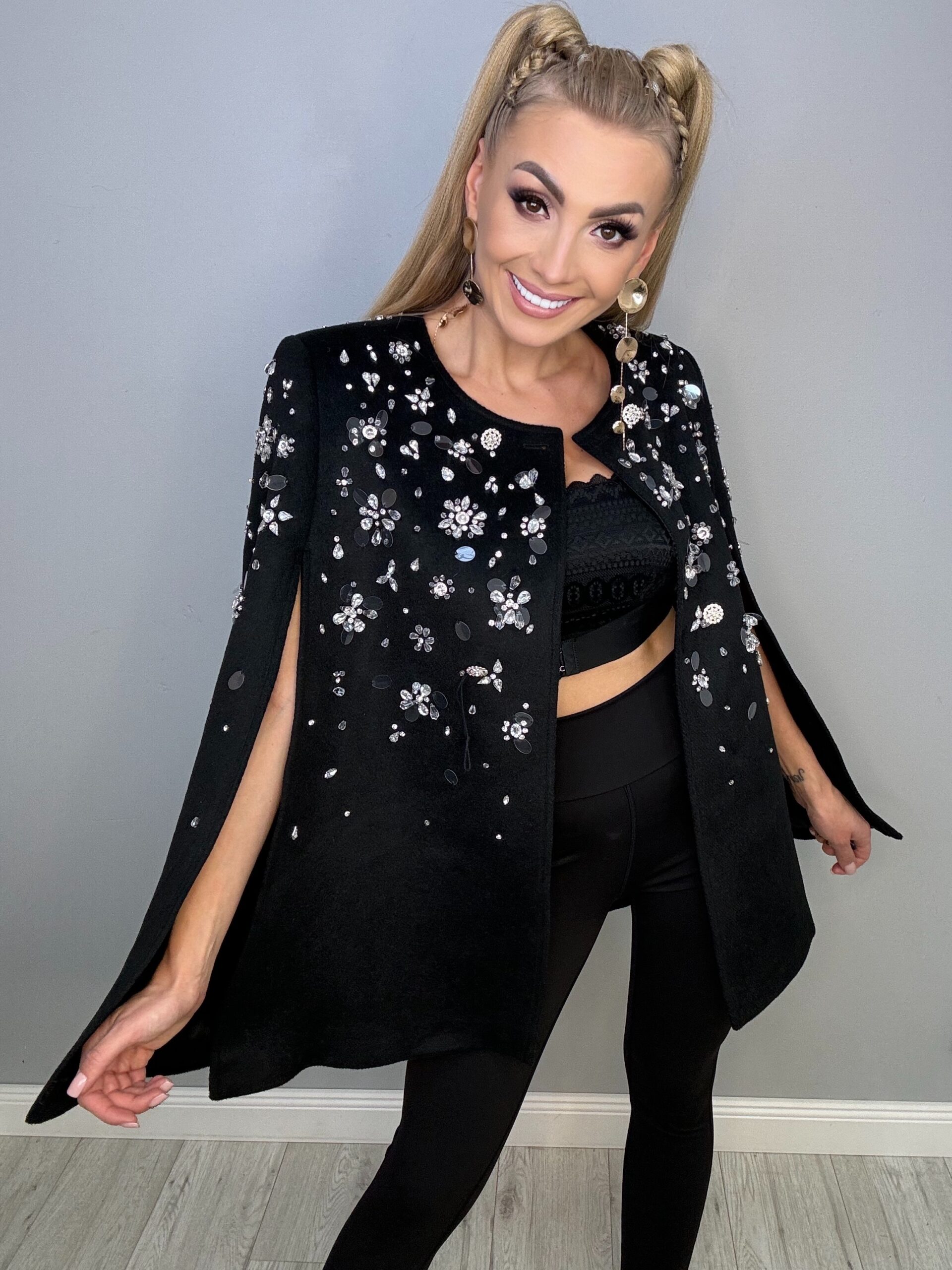 Odkryj niezwykły płaszczyk a’la batman, wykonany z najwyższej jakości kaszmiru, który zachwyca luksusowym materiałem. Całość została misternie zdobiona ręcznie wyszywanymi, przepięknymi i ekskluzywnymi ozdobami, które nadają mu niepowtarzalny charakter.