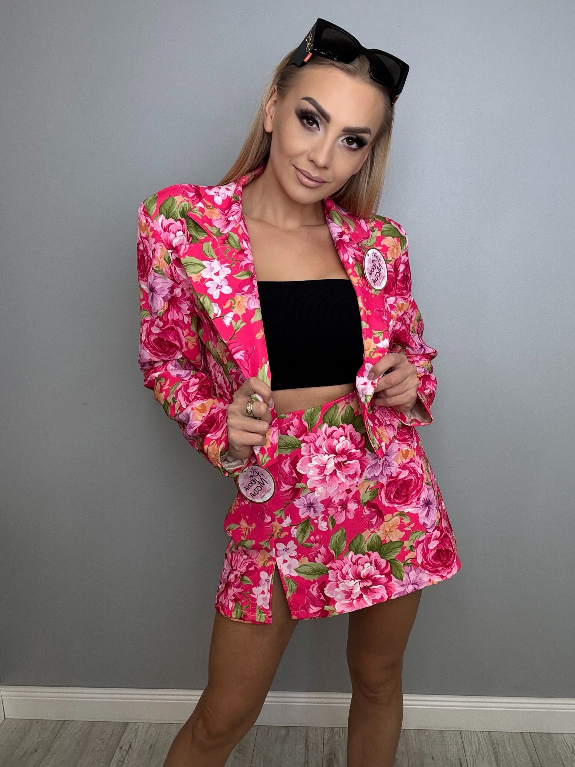 Całość zestawu utrzymana jest w intensywnej, kwiatowej kolorystyce, która dodaje świeżości i energii każdej stylizacji. To doskonały wybór na spotkania, randki czy wieczorne wyjścia – wystarczy dodać szpilki lub eleganckie sandałki, aby stworzyć pełen wdzięku, kobiecy look.