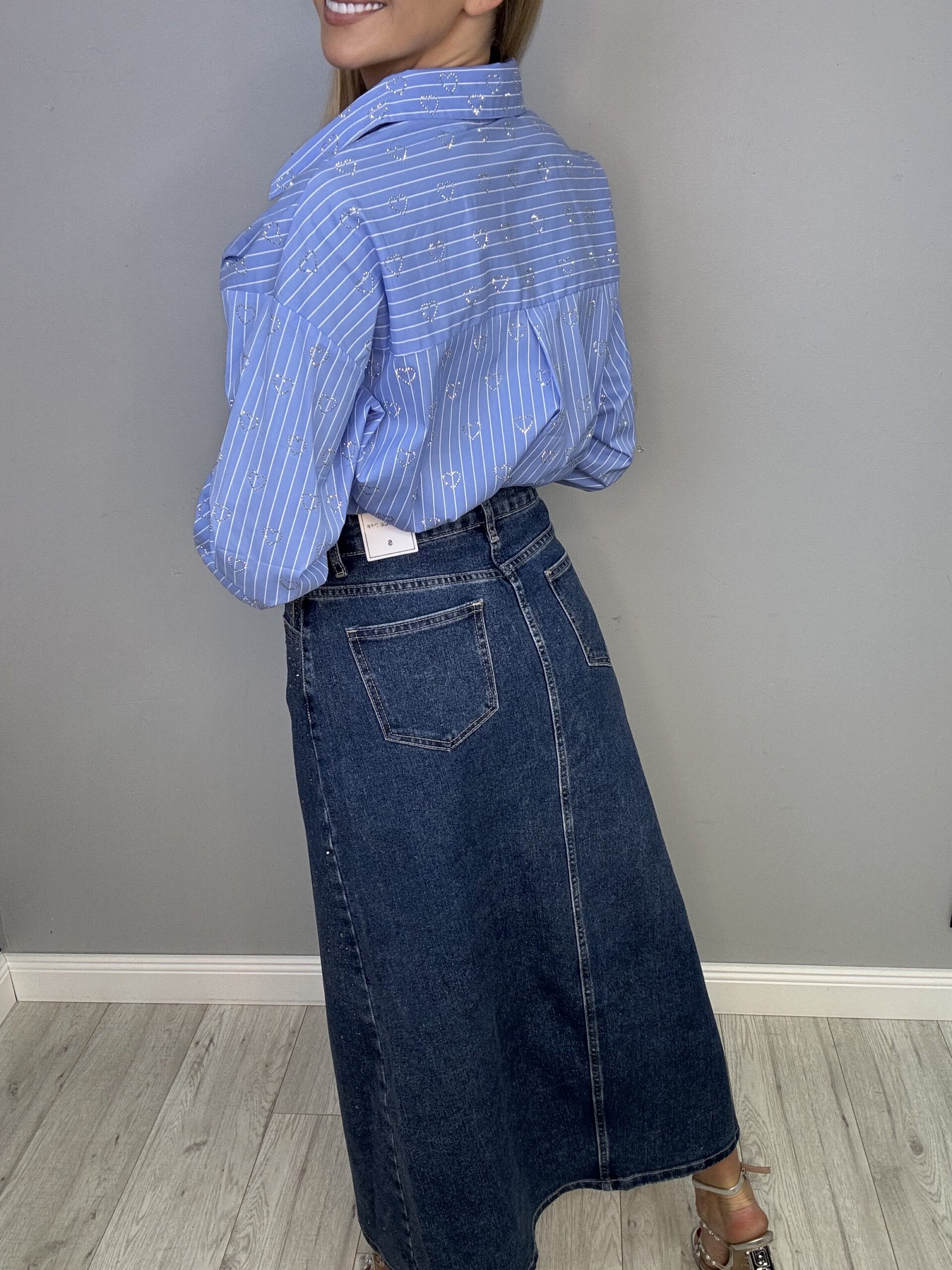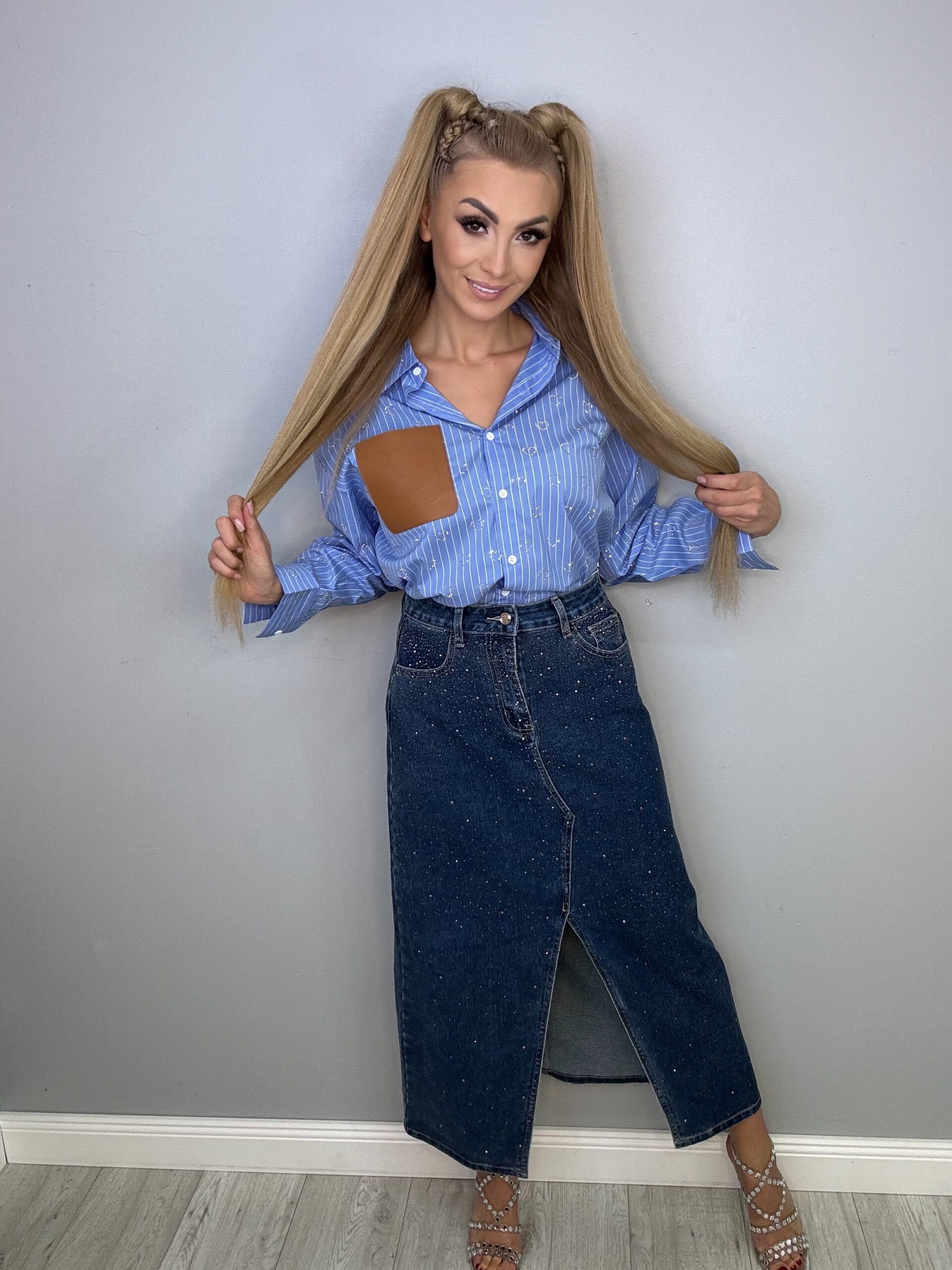 Jeansowa spódnica maxi z rozcięciem i zdobieniami