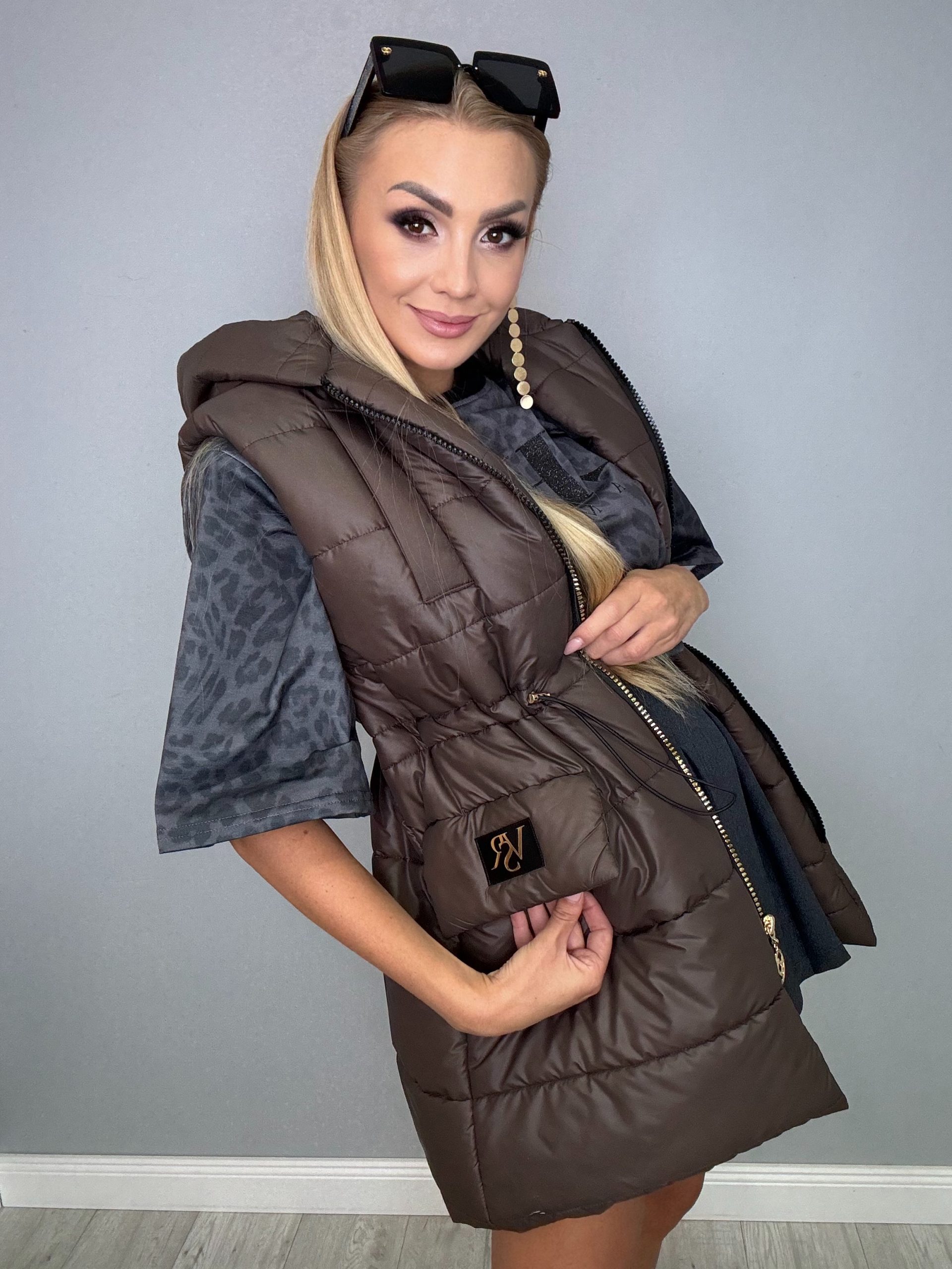 Kamizelka czekoladowa wykonana z wysokiej jakości materiałów, charakteryzuje się regulacją w pasie, co pozwala na idealne dopasowanie do sylwetki.
