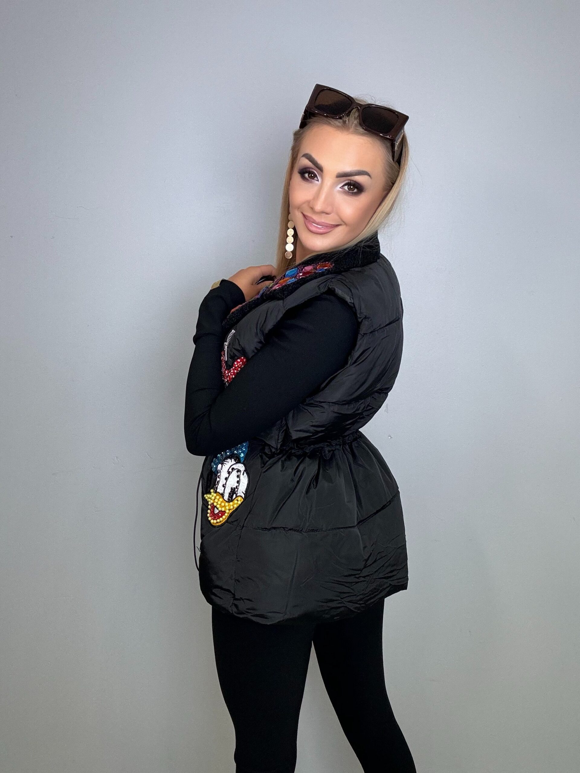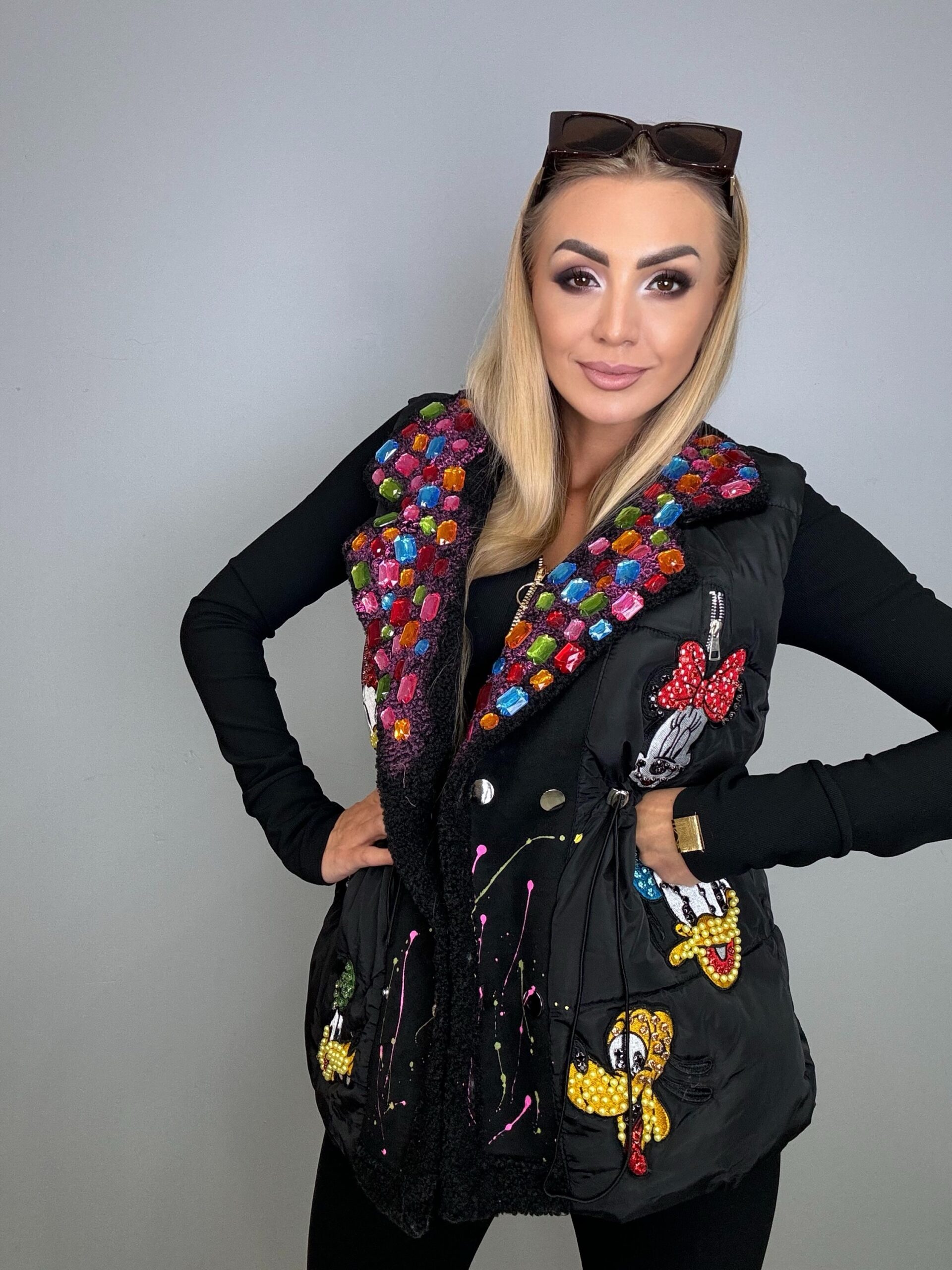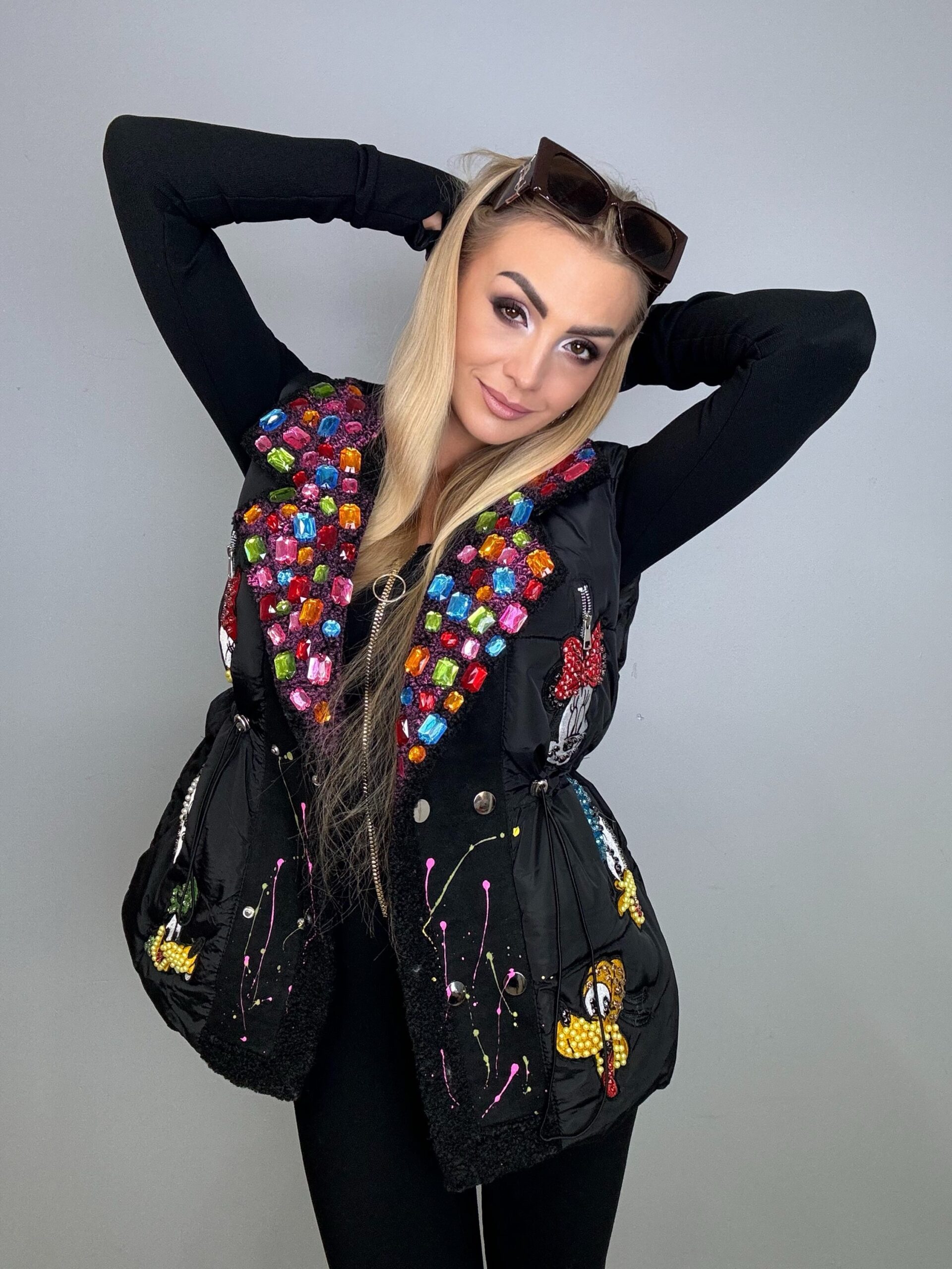 Ocieplana kamizelka klasy premium, wykonana z wysokiej jakości materiałów, które zapewniają komfort noszenia i świetne dopasowanie. Model wyróżnia się efektownym, bogato zdobionym kołnierzem – aplikacje z wielokolorowych kryształków i kamieni nadają całości luksusowego, biżuteryjnego charakteru.