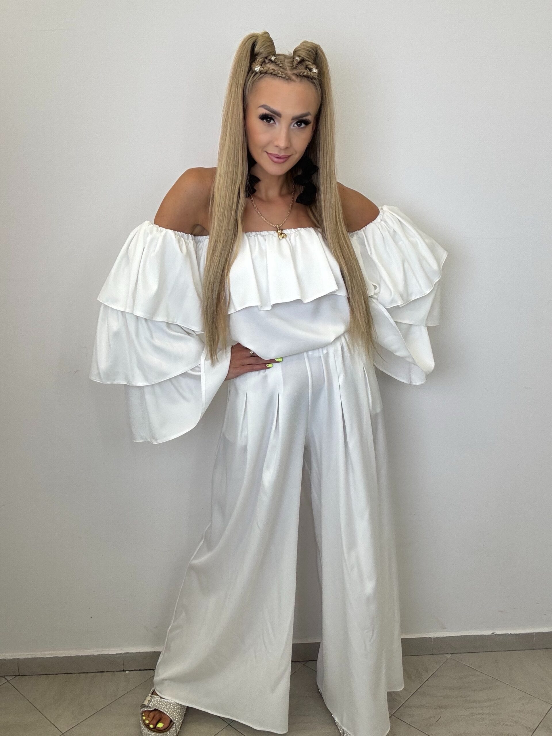 Elegancki, kobiecy komplet, który łączy wygodę i styl. Składa się z modnej bluzki typu hiszpanka z opadającymi ramionami i efektowną falbaną oraz szerokich, lejących spodni z wysokim stanem. To idealna stylizacja na cieplejsze dni – sprawdzi się na spacer, spotkanie czy letnie przyjęcie.
