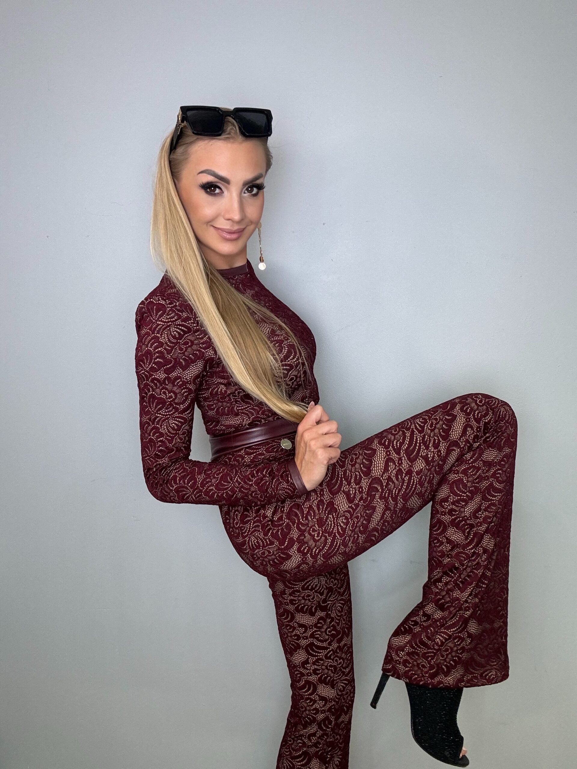 Zjawiskowy kombinezon wykonany z elastycznej koronki w eleganckim, bordowym kolorze. Idealnie dopasowuje się do sylwetki, podkreślając kobiece kształty i zapewniając jednocześnie komfort noszenia. Model posiada długi rękaw oraz dopracowane detale, które nadają mu wyjątkowego charakteru.
