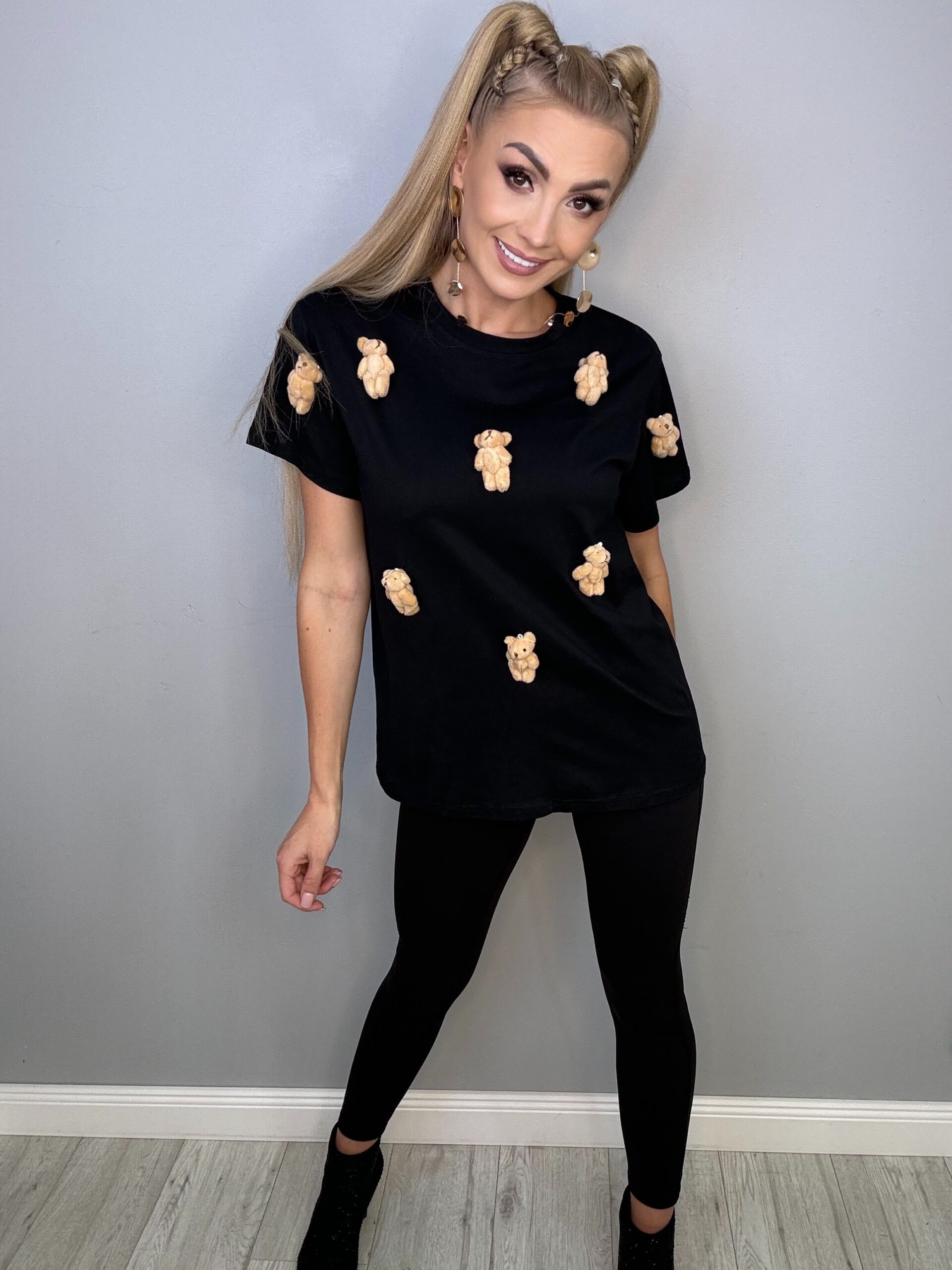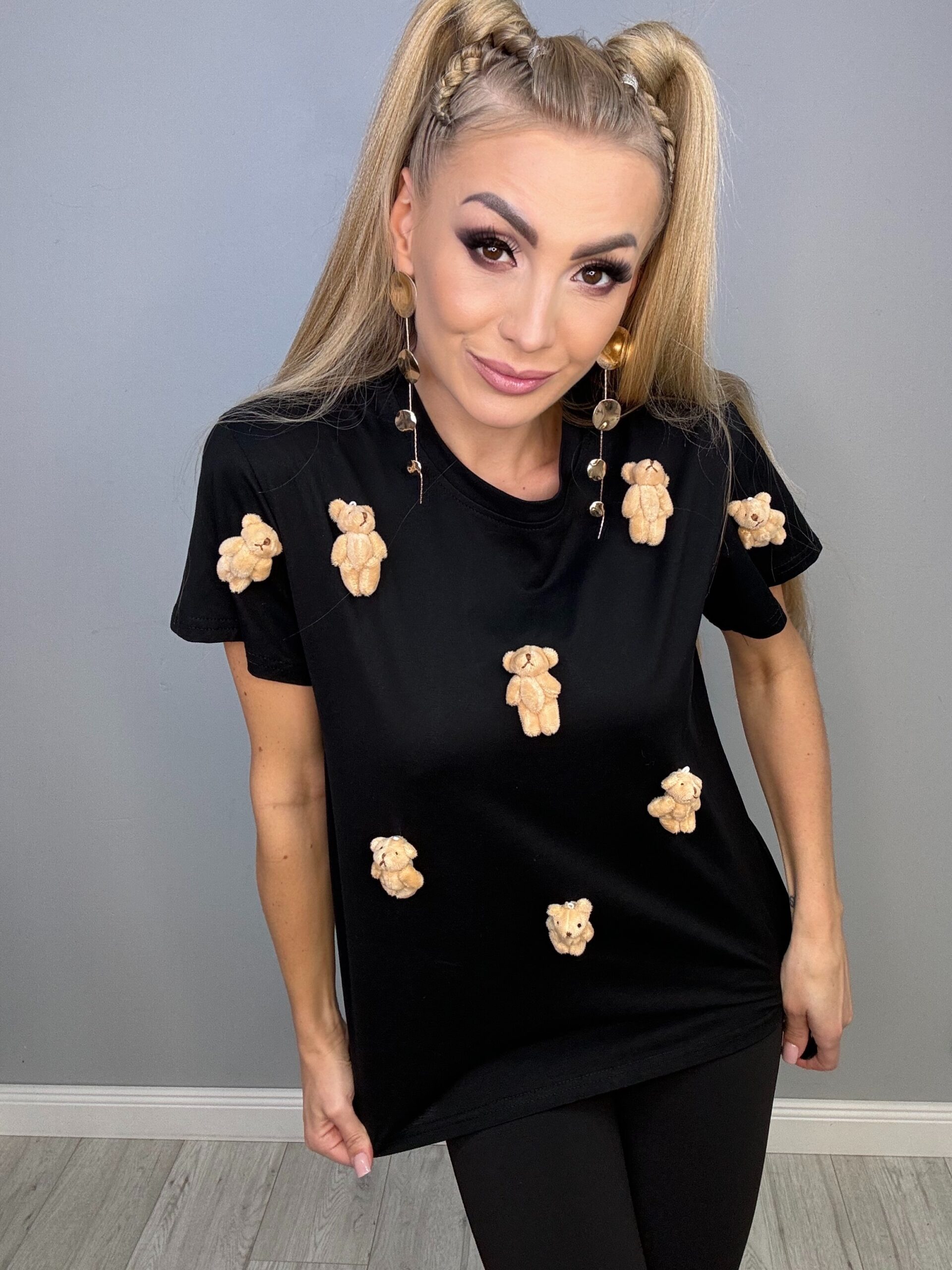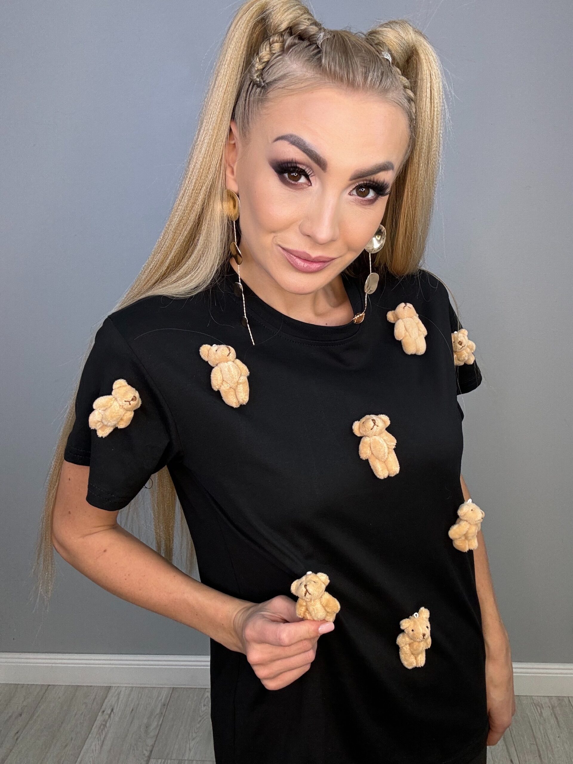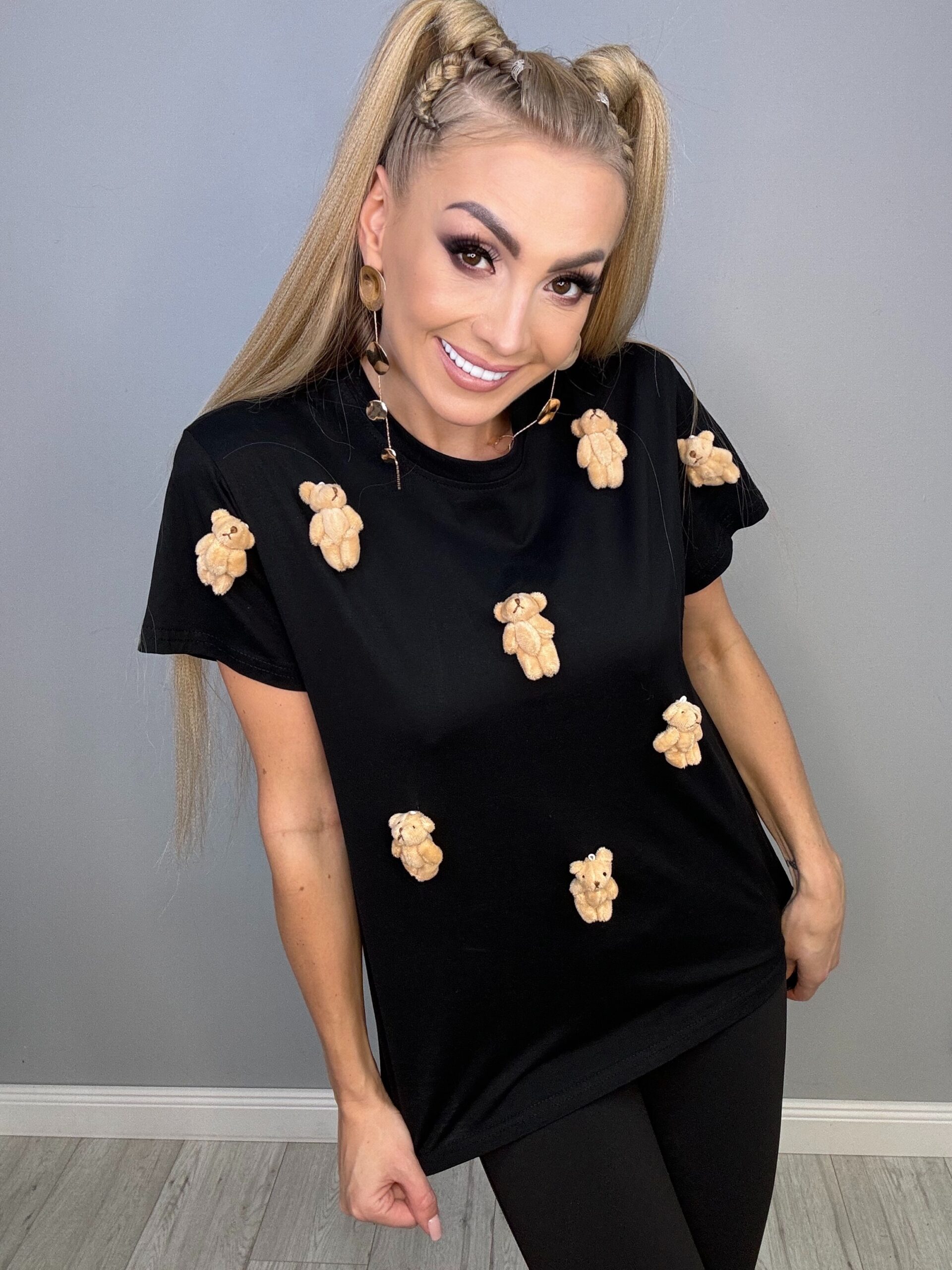 Ta fantastyczna czarna koszulka w rozmiarach od XS do L to idealny wybór dla miłośników uroczych detali. Z ozdobnymi malutkimi misiówkami, które nie są wyszywane, prezentuje się naprawdę słodko i nietypowo. Doskonale komponuje się zarówno z jeansami, jak i spódnicami, dodając każdej stylizacji niepowtarzalnego charakteru.