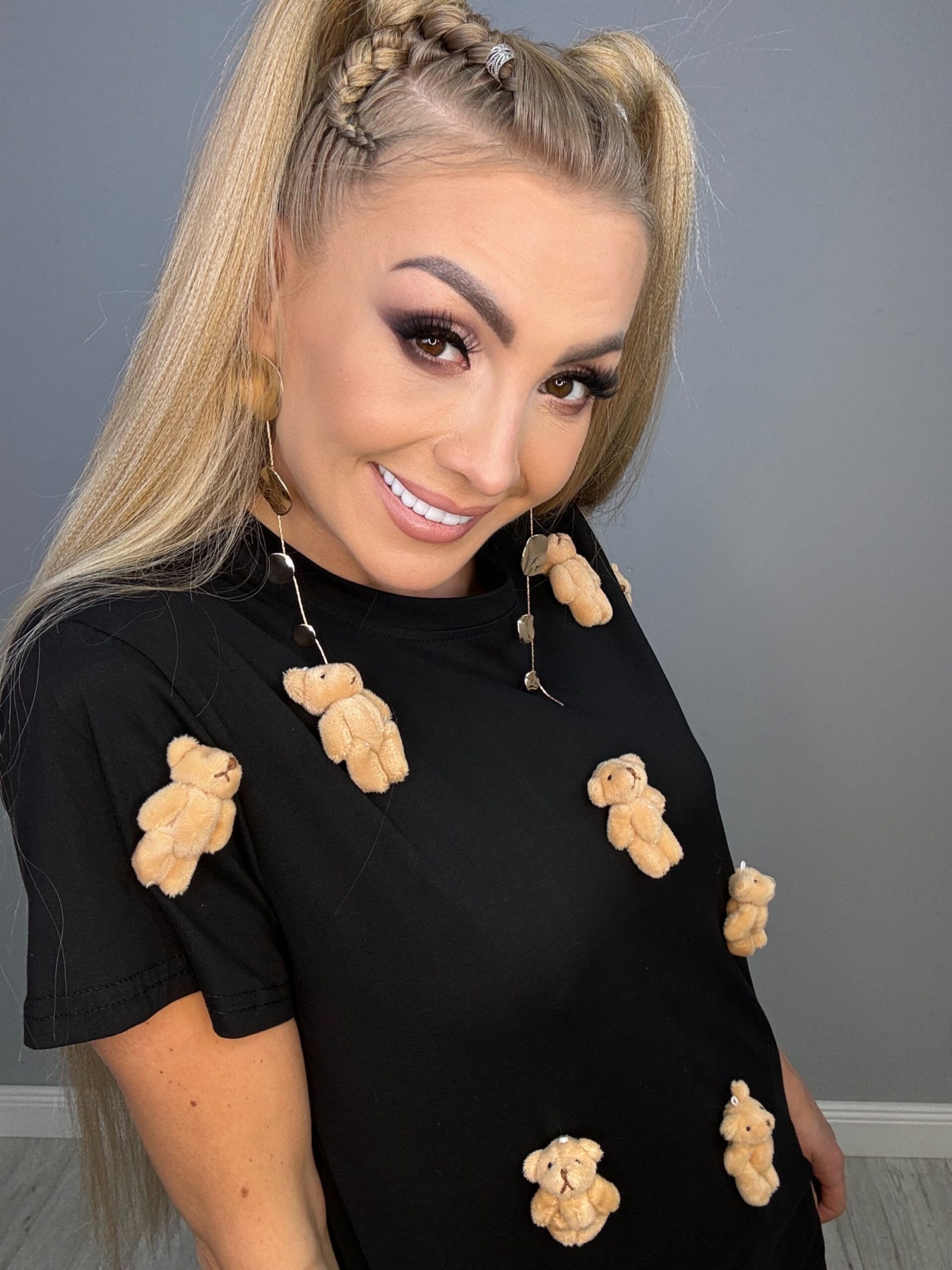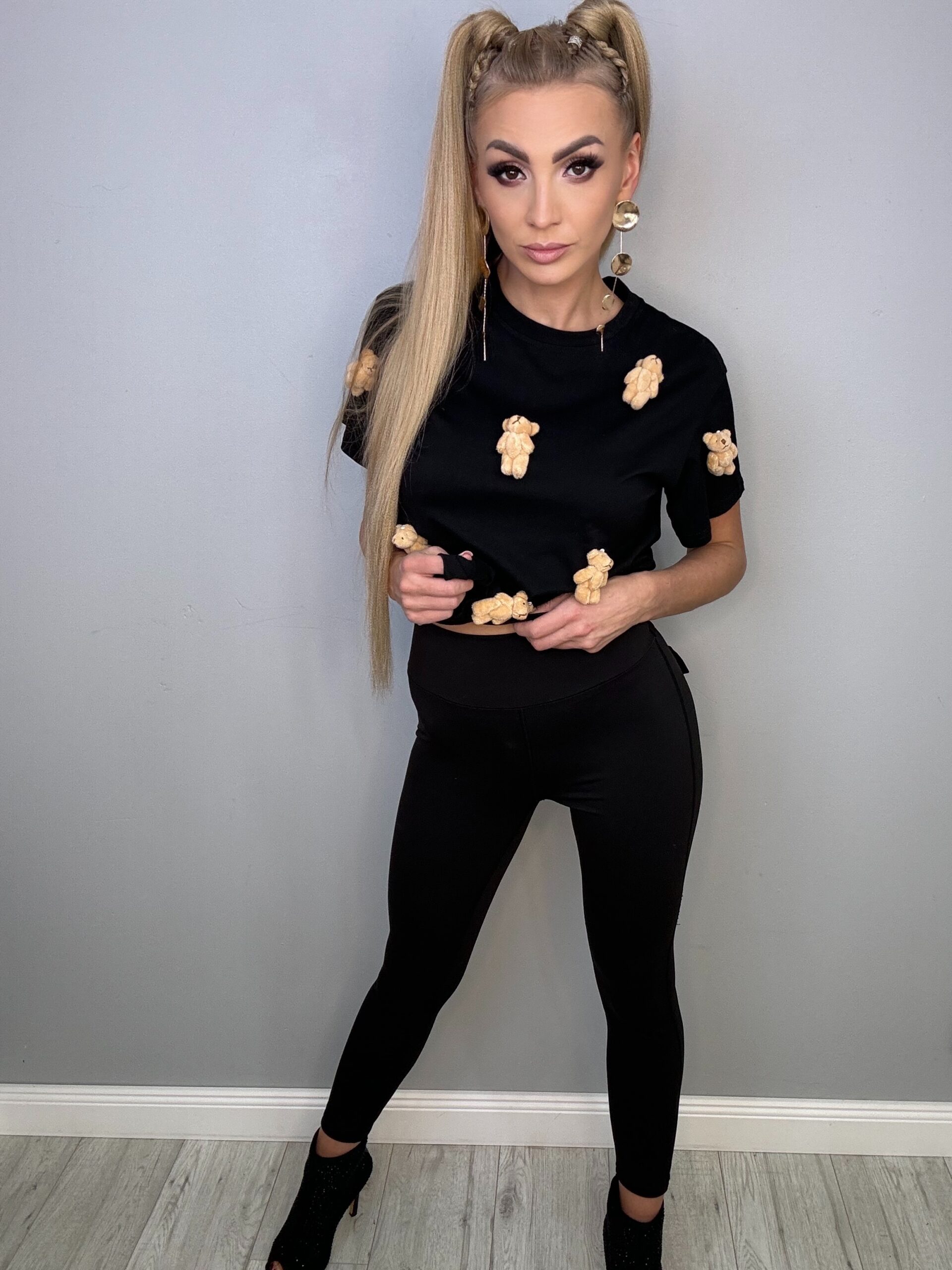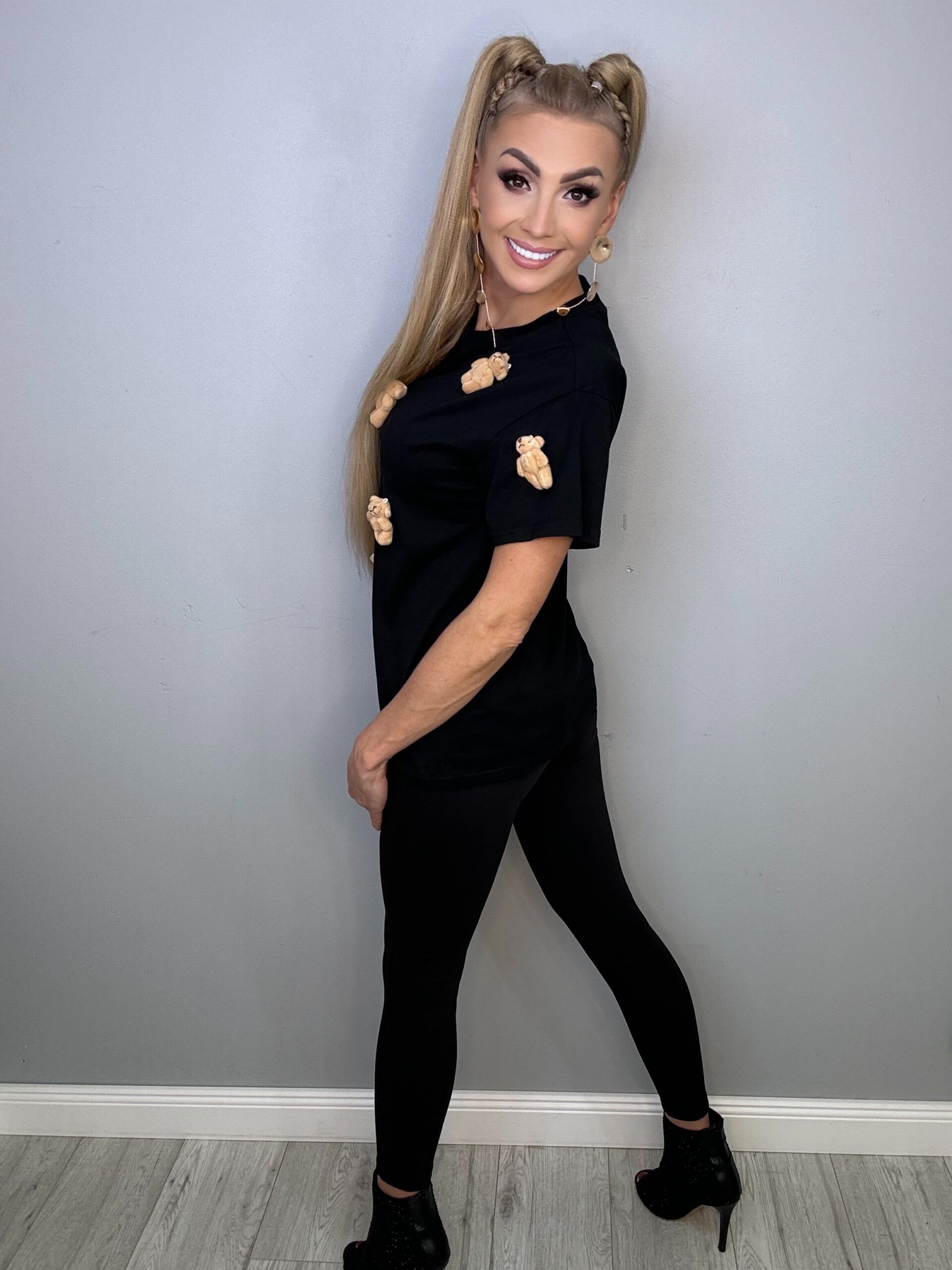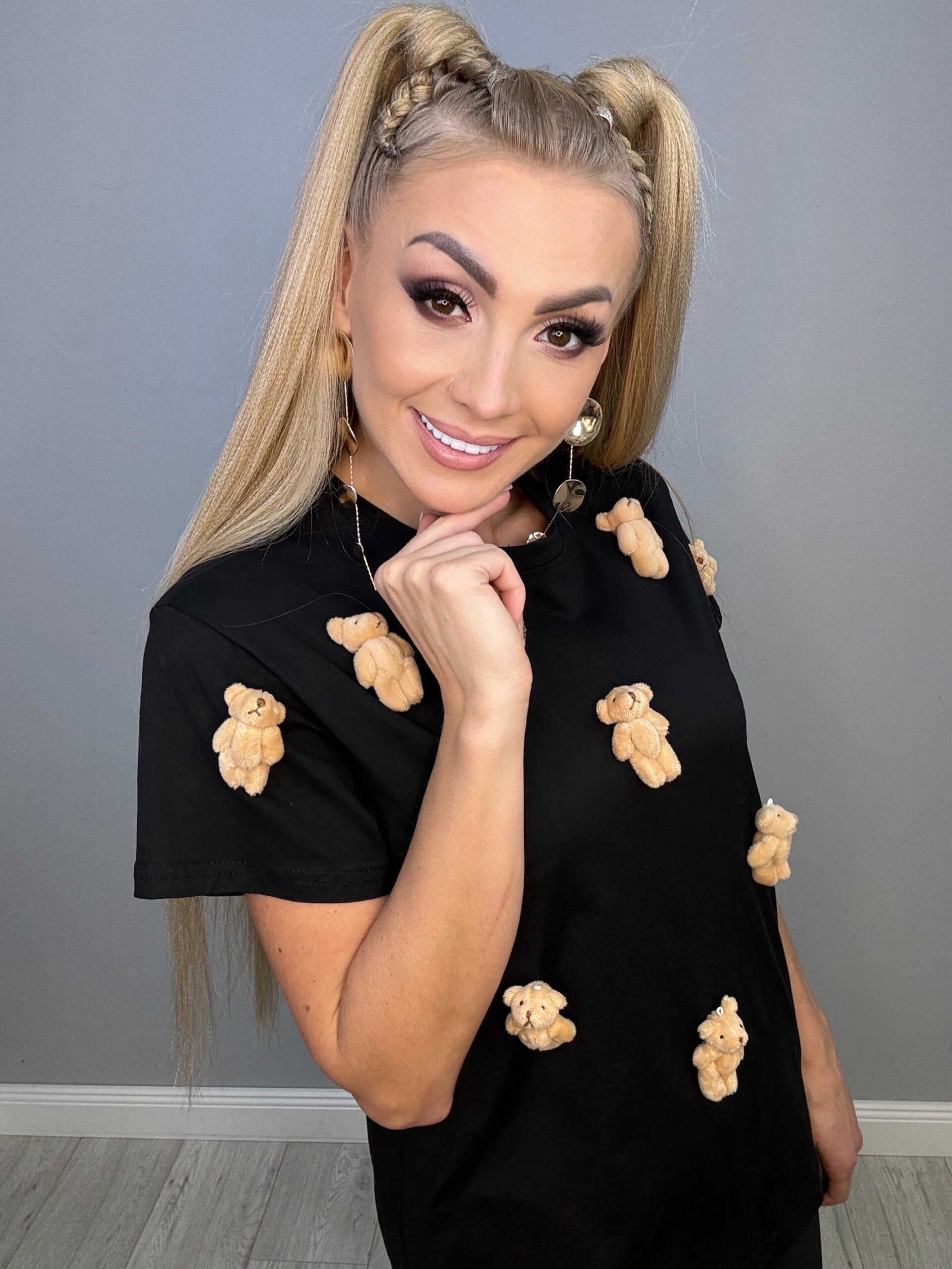 Ta fantastyczna czarna koszulka w rozmiarach od XS do L to idealny wybór dla miłośników uroczych detali. Z ozdobnymi malutkimi misiówkami, które nie są wyszywane, prezentuje się naprawdę słodko i nietypowo. Doskonale komponuje się zarówno z jeansami, jak i spódnicami, dodając każdej stylizacji niepowtarzalnego charakteru.