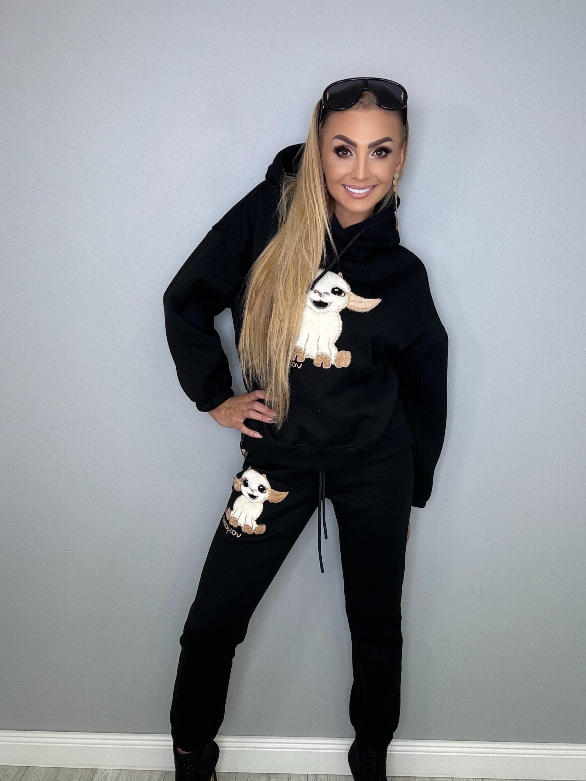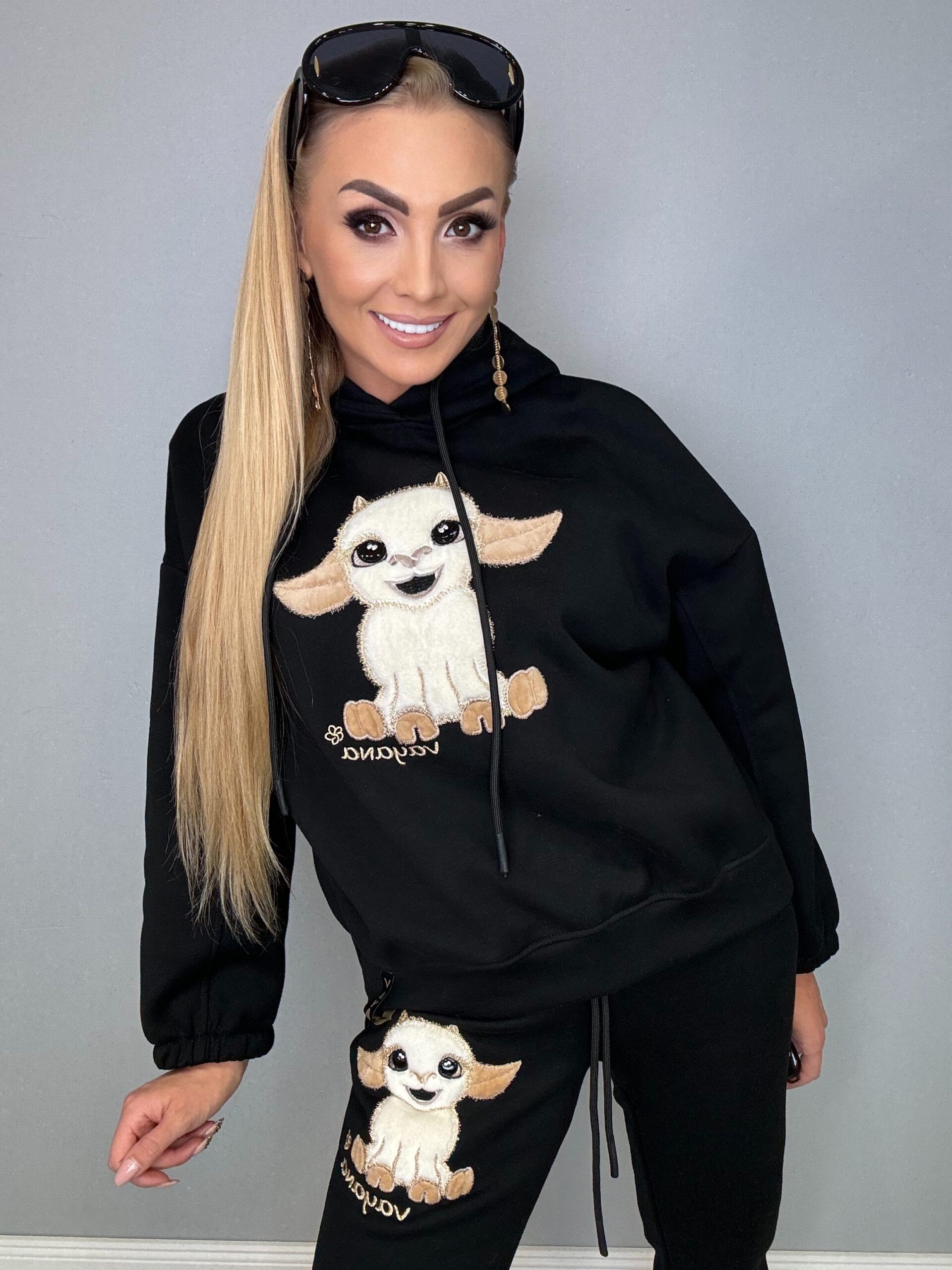 Stylowy dres od firmy VAYANA, ocieplony i bardzo wygodny, idealny na chłodniejsze dni. Posiada atrakcyjną aplikację z uroczym motywem kózki zarówno na bluzie z kapturem, jak i na spodniach. Kaptur jest wykończony firmowym logo, co podkreśla oryginalność produktu. Dres wyróżnia się solidnym wykonaniem oraz przyjemnym w dotyku materiałem, co sprawia, że jest idealnym wyborem dla osób ceniących modny i komfortowy styl. Występuje w kolorze śmietankowym, beżowym oraz czarnym. Dostępne rozmiary to 1 (S), 2 (M) i 3 (L)