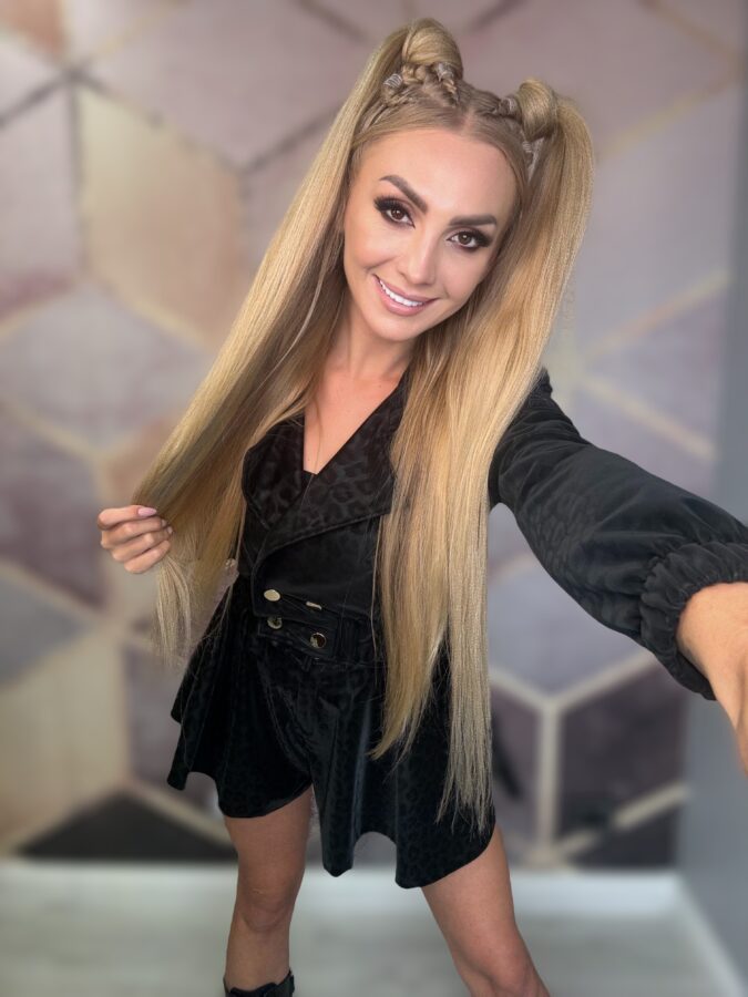Na zdjęciu modelka ma 172 cm wzrostu i waży 59 kg.