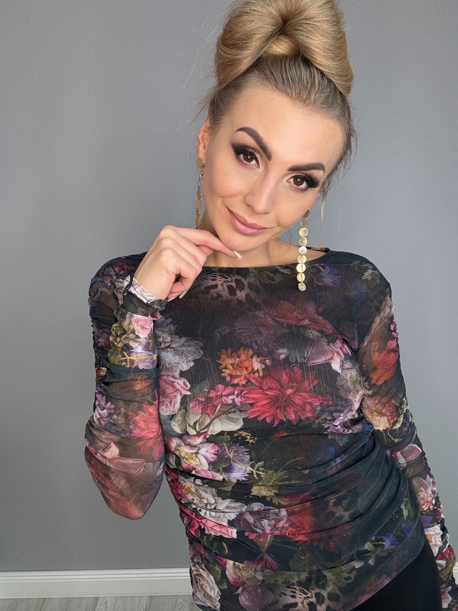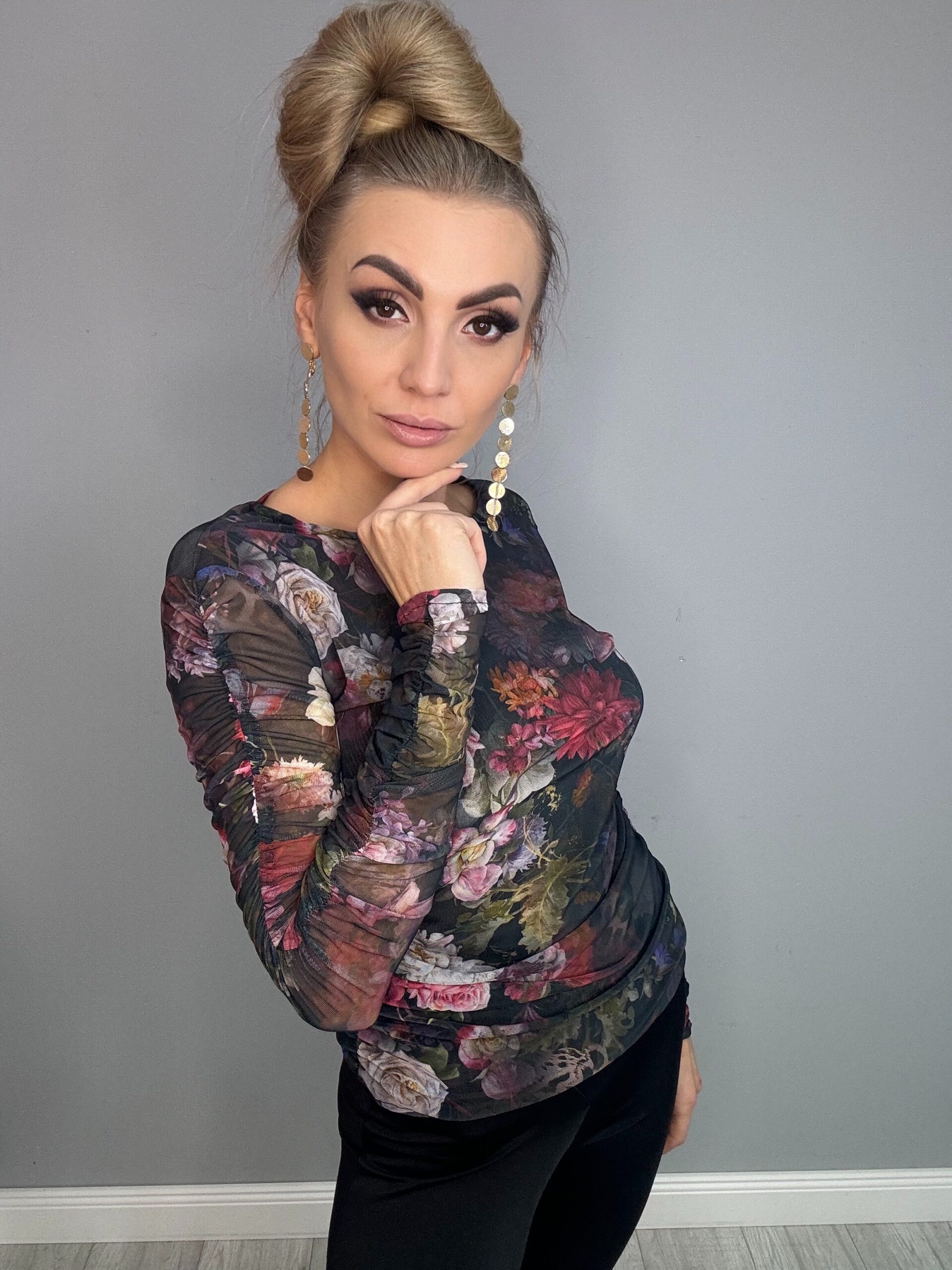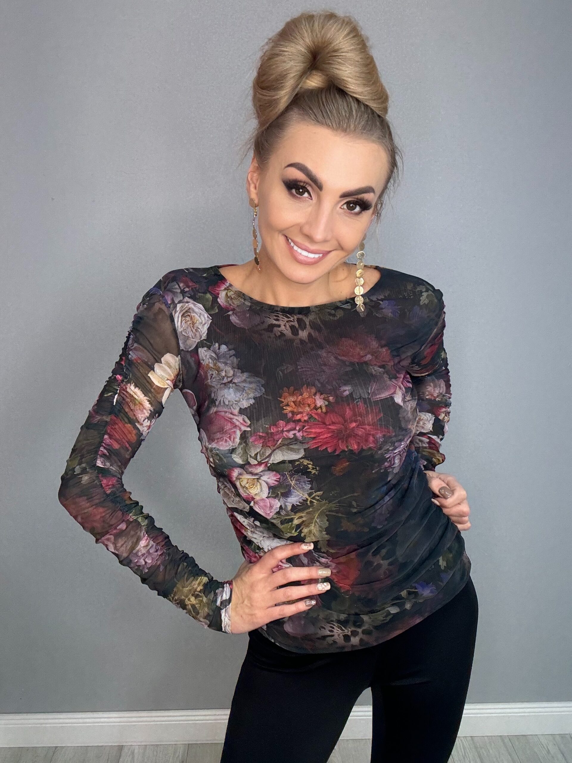 Elegancka bluzka z siatki, ozdobiona pięknymi, kwiatami. Materiał jest częściowo podszyty, co sprawia, że nie jest prześwitująca, natomiast rękawki wykonane z jednej warstwy siatki są delikatnie przezroczyste. To idealny wybór na każdą okazję, łączący elegancję z odrobiną zmysłowości.