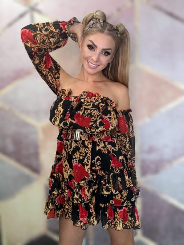 Zjawiskowa sukienka z falbankami, stworzona z lekkiego i delikatnego materiału. Posiada modny print oraz piękną kolorystykę.