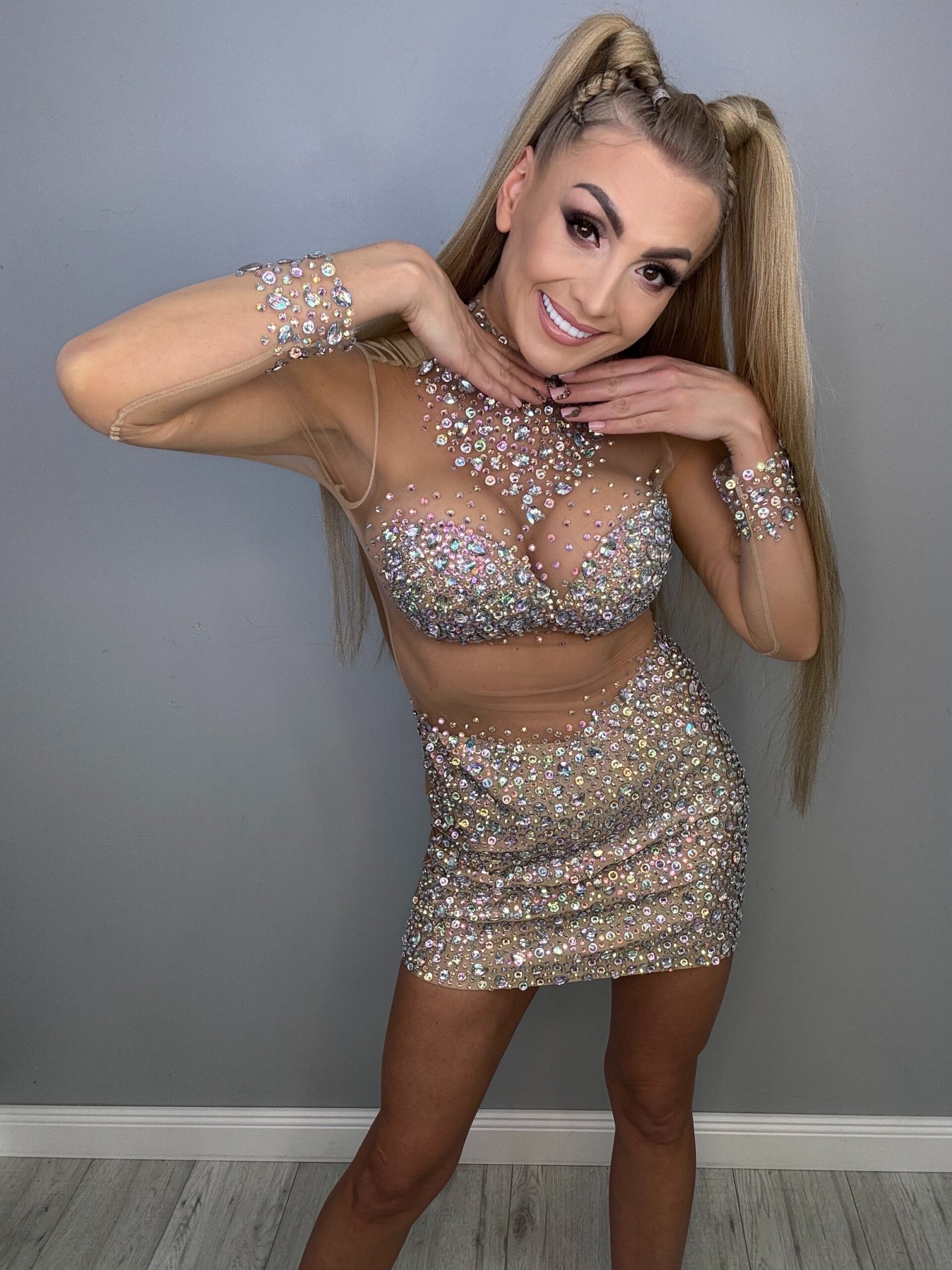 Sukienka, która zachwyca bogactwem zdobień i niepowtarzalnym blaskiem. Wysadzana ozdobnymi kamieniami, które pięknie odbijają światło, staje się prawdziwą perełką w każdej kolekcji.