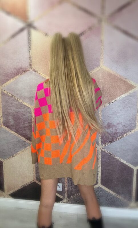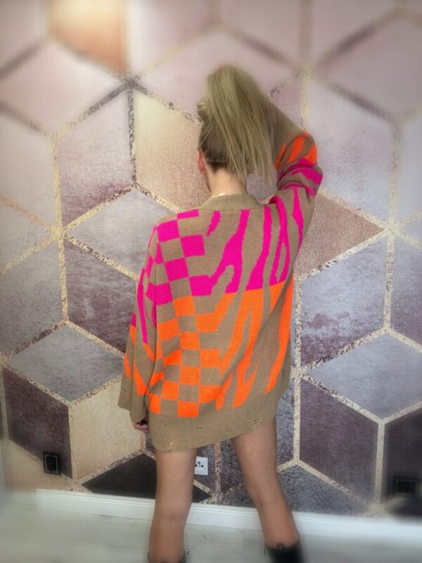 Sweter we wzory pomarańczowo-różowe z modnymi dziurami