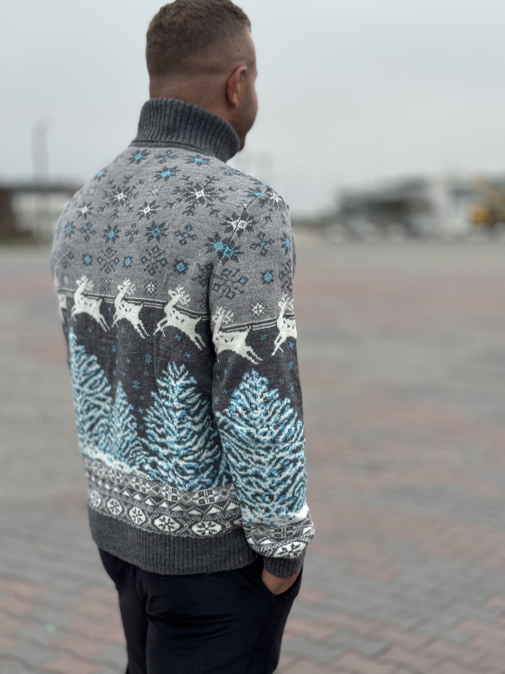 Fantastyczny golf męski, który idealnie wpisuje się w świąteczny klimat! Zjawiskowy wzór w odcieniach szarości, błękitu i bieli przyciąga wzrok.