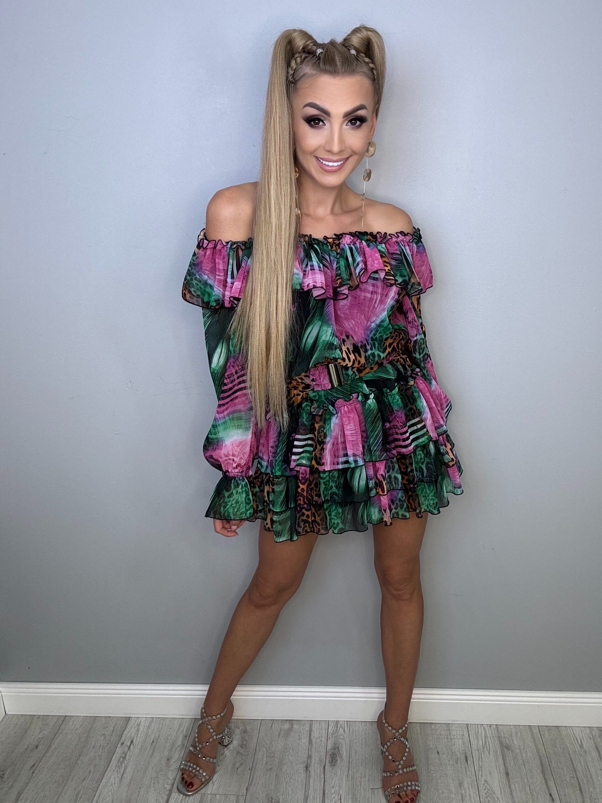 Zaprezentuj się w tym zachwycającym kombinezonie w stylu sukienki, stworzonym z lekkiego szyfonu. Jego elegancki krój i zwiewny materiał idealnie podkreślają sylwetkę, a motyw zwierzęcy w tropikalnych kolorach dodaje mu ekskluzywnego charakteru.